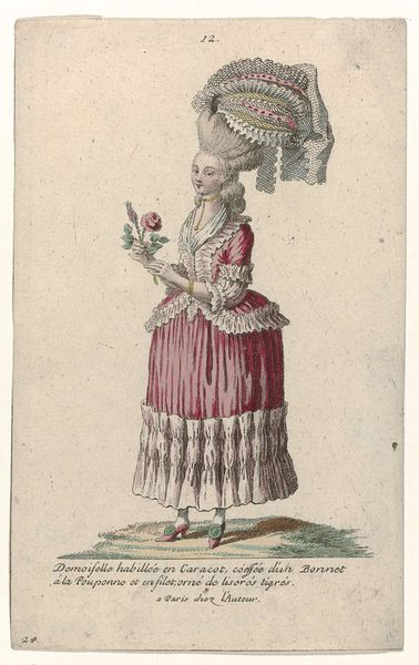 Curator: My goodness, it's quite the confection, isn't it? Editor: Indeed! What is this visual sugar rush? Curator: We're looking at a mixed-media print by Pierre Gleich, dating to around 1785. It's titled "Gallerie des Modes et Costumes Français, 1785, nr. 26, nr. 51, Kopie naar K 55 : Jolie Femme en Circassienn...". Quite a mouthful, I know! Editor: You know, 'Rococo' immediately springs to mind. All that playful opulence and artifice. But what intrigues me are the layers, those visible elements suggesting a world beyond simple courtly display. Curator: Spot on. While the extravagant dress is immediately captivating – and look at the size of that hairpiece! – the fashion plate served a practical purpose too, in this case a reflection of the styles circulating among the aristocratic elite in France. What does the sartorial symbolism tell you? Editor: Oh, where to start? The "Circassian" element nods to a romanticized idea of the exotic "other" from the Caucasus region. That headdress, laden with feathers and what appears to be fruit, isn’t just about beauty; it signals wealth, status, global reach, colonial exploits... Each carefully chosen ornament becomes a tiny signifier of power and influence. She isn’t just wearing a dress, she’s wearing an empire. Curator: And that pale pink colour. Editor: Yes, pink, once strongly associated with masculinity, becomes increasingly feminized by the late 18th century – and she stands out! Also notice how delicate the lines are, that hand-tinted watercolor. Even with so much 'stuff', there's an incredible lightness and grace, almost like she might float away. Curator: It is light, definitely designed to capture the moment and the movement, a glimpse of an elite in a world about to change. Editor: Exactly. So beneath all the powdered wigs and extravagant flounces, it whispers of privilege and societal change about to arrive. An invitation to delve a little deeper. Curator: Very true. This work is a glimpse of something evanescent but, in this depiction, still hanging on...
