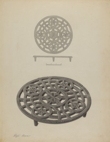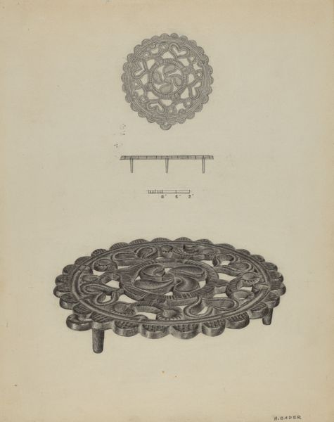 This trivet rendering was made by Charles Cullen, at an unspecified date, using graphite and colored pencil on paper. Look at how Cullen methodically details the object. The even application of shading and shadow demonstrates a thoughtful process. It’s like a dance between observation and precision. The texture is smooth, almost metallic, and the subtle color variations give the trivet a tangible weight. He renders the circular forms and their intersections with a careful eye, giving the illusion of depth and volume. Notice the stippling on the circles, each mark building up the form. I am reminded of the work of Albrecht Durer in the way the artist has meticulously documented and recreated the scene. But there is also a sense of play, as if Cullen is exploring the possibilities of the medium. It reminds us that art is not just about the end result, but about the journey of discovery.