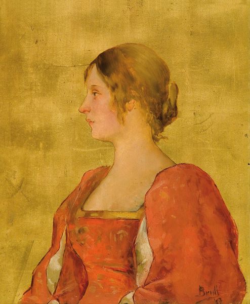 Curator: This is Jean Benner’s “La France pour toujours!” completed in 1871, executed in oil paint. Editor: It's quite striking; I immediately notice the palpable sense of melancholic longing in the woman's upward gaze, contrasting with the richness of that almost Byzantine gold backdrop. Curator: Note the compositional structure. Benner utilizes a strong vertical orientation. The young woman is centered, drawing the viewer's eye directly to her face and the details of her traditional Alsatian dress. Her gaze is positioned precisely in the upper portion of the frame, accentuating the sense of hope or aspiration. Editor: The fact that it was painted in 1871—a year marking the end of the Franco-Prussian War, with France ceding Alsace-Lorraine to Germany—is critical to interpreting that gaze. It’s not just aspiration; it's an expression of cultural and national grief and resilience, specifically for Alsatian identity. The Tricolore rosette attached to her headdress only reinforces this. Curator: Precisely, and Benner emphasizes that sentiment through the use of color. The muted tones of the clothing, primarily black and white, provide a somber foundation, setting off the subtle vibrancy in her complexion and auburn hair, giving her a transcendent, spiritual aura. Observe, also, the subtle details in the lace and embroidery; minute details that contribute to an overwhelming impression of beauty despite historical tragedy. Editor: The symbolism is potent. She embodies the spirit of Alsace, a region torn between two national identities. The averted gaze is key, rejecting present circumstance, and instead yearning for what’s lost or could be regained. It's an intersection of regional identity, nationalism, and even femininity under duress. Her clasped hands too signify both powerlessness and determination to stay strong, to hold onto tradition and to resist colonial erasure. Curator: The gold background acts as both halo and void. Editor: A gorgeous, complex portrait where visual language profoundly reinforces historical context, creating a deeply emotive and compelling narrative about nationalism and occupation. Curator: I find the controlled palette lends the work both intimacy and monumental grandeur. It encapsulates collective mourning within one human figure.