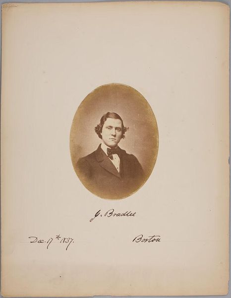 Curator: John Adams Whipple created this portrait, "William Arthur Kilbourn, Groton, Massachusetts," sometime between 1838 and 1912, capturing a sense of early American life. Editor: The sepia tones lend a melancholic air, don't they? The oval framing and soft focus concentrate attention on the subject’s face and attire, but he seems a bit lost in thought. Curator: The formal presentation—his tailored suit, the deliberate pose—speaks to the rise of photography's role in shaping social identity. This portrait marks a moment of democratization in image-making. Editor: Interesting point! From a purely visual perspective, observe the artist's delicate manipulation of light and shadow, creating a subtle, almost painterly effect. Curator: It underscores the cultural value placed on representation and memory, especially for a burgeoning middle class asserting their place in society. Editor: I agree! It is a touching, intriguing glimpse into another era.