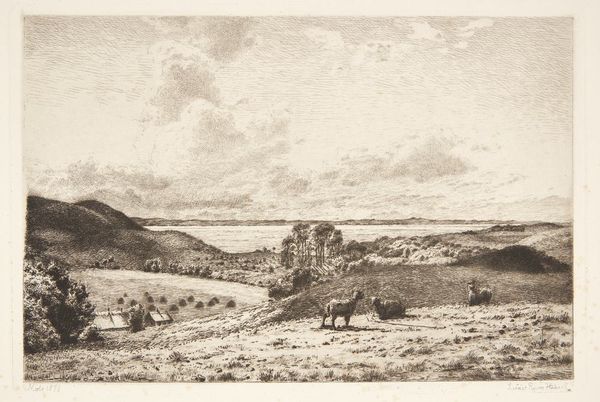 Editor: We are looking at Louise Ravn-Hansen's "Landskab fra Rinn. Tyrol." created in 1895. It’s a landscape print, and the incredible detail achieved through etching gives it such a peaceful mood. What strikes you most when you see this piece? Curator: What stands out is the negotiation of landscape as both a space of cultivated beauty and potential contestation. Consider the time period: the late 19th century, a period defined by rapid industrialisation. How does Ravn-Hansen present nature here – is it idealized, or does she acknowledge the ways human activities have shaped it? Think about ownership, access, and even the symbolic weight of ‘landscape’ itself within a rapidly changing society. Does this composition speak to a specific social class perspective, perhaps romanticizing rural life even as its traditions were disappearing? Editor: That's an interesting point about the shifting social landscape. I hadn’t thought of it that way. It does feel quite romantic in its rendering, with a kind of softness that suggests a longing for the pre-industrial era. Curator: Exactly! The very act of capturing and framing this scene becomes a political statement. Which parts of this scene are emphasised through the artist's skillful etching? Which seem intentionally downplayed? Why? The absence of certain realities, such as labour or poverty, is as telling as what is explicitly depicted. How is the idea of progress operating within a space that simultaneously seems stuck in time and clearly altered through paths, property lines, etc. Editor: It does invite further questioning when seen that way! The careful details like the distant houses highlight the intrusion of human activity. The work's seeming simplicity now feels loaded with implications. Thank you. Curator: These kinds of quiet landscape scenes often hide very loud and complex questions around place, belonging, and power. Remembering that is crucial.