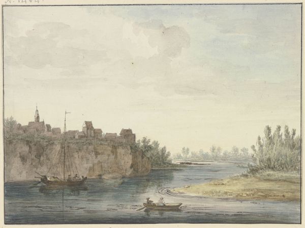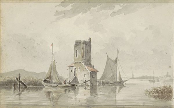 Editor: So, this watercolor painting is titled "Cairo," created by David Roberts between 1846 and 1849. The architectural forms have this amazing solidity, while the watercolor medium gives everything an ethereal, almost dreamlike quality. How do you interpret the visual symbols and imagery in this piece? Curator: The dreamlike quality you mention is key. Roberts is not just depicting Cairo; he's invoking a culturally constructed idea of the Orient. Consider the ruinous architecture: are these signs of decay or symbols of endurance, whispering tales of empires past? The aqueduct, reaching into the distance, might signify not just an engineering feat, but also a conduit of history, memory, and cultural exchange. Editor: That's fascinating. The ruinous aspect made me think more about Romanticism and less about Orientalism at first glance. So, the cultural memory attached to the Orient reshapes even ruins here? Curator: Precisely! The Orient, especially Egypt, had become a potent symbol in the Western imagination, fueled by both scholarly interest and colonial ambitions. The boats on the river—are they mere transportation or symbols of connection and cultural interaction, for instance? Also, does the calm, serene tone contribute to a romanticized perception of a land both ancient and 'exotic?' Editor: The serenity does seem to highlight a Western perspective imposed upon a very complex and dynamic society. I'm starting to see that Roberts is weaving a narrative about Cairo using loaded symbols and imagery. Curator: And how these symbols perpetuate, or perhaps even challenge, existing cultural narratives. The painting encourages us to reflect not just on Cairo's history but on our own cultural lenses. Editor: I never considered the cultural baggage behind even a landscape! That really enriches the viewing experience. Curator: Indeed, every stroke carries meaning and is itself part of history.
