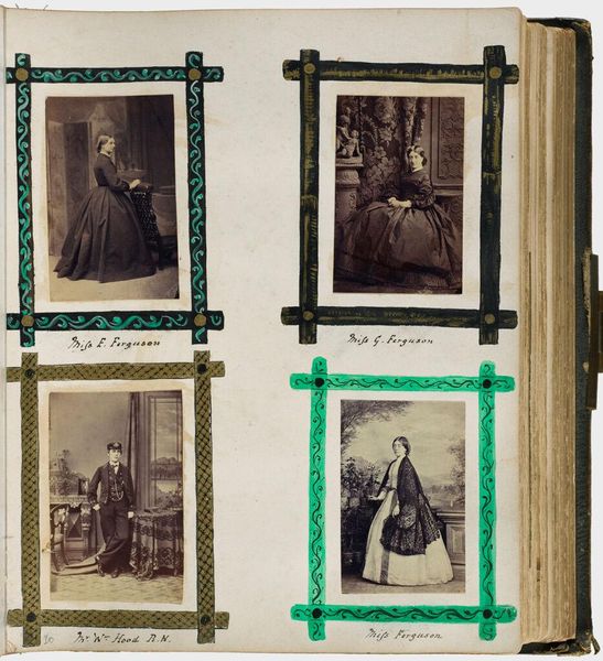 Curator: This page from an album holds five portraits by Mary Georgiana Caroline Cecil Filmer, each a window into Victorian society's elite. What strikes you first about their arrangement? Editor: The formality, definitely. They're all posed, almost staged. I wonder, what does it mean to create images like this, displaying wealth and status so openly? Curator: Exactly! Consider the power dynamics at play. Photography, newly accessible, becomes a tool for the upper class to define and solidify their identity. How might gender and class intersect in these images? Editor: The women are so elaborately dressed, almost like commodities. Mr. Teedcroft, in the center, seems to command the space. Did Filmer intentionally critique this hierarchy, or reinforce it? Curator: That's the crucial question! By examining Filmer’s position within that society, we can begin to understand her intentions, or perhaps, the limitations placed upon her gaze. What have you learned? Editor: I see how photography can be both a mirror and a maker of social norms, freezing class structures.