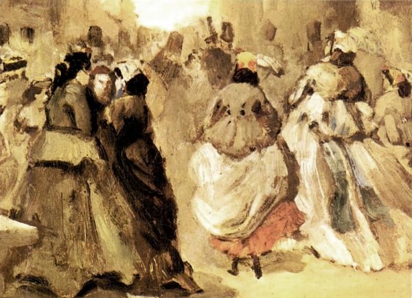 Editor: So, here we have Degas's "Exit from Weighing," painted in 1866. It seems like a snapshot of a racetrack scene. I'm really struck by the loose brushstrokes and how it captures a sense of movement, almost as if the scene is unfolding before us. What is your perspective on this? Curator: What arrests me most in "Exit from Weighing" is its composition. Note how Degas deliberately disrupts the traditional central perspective. The vanishing point is not neatly in the middle, but subtly shifted to the left. The figures are cropped, not idealized. It produces a dynamic asymmetry that reflects a modern sensibility, wouldn't you agree? Editor: I can see what you mean, the skewed perspective does give it an immediacy. But beyond the technique, does the subject matter play a significant role in interpreting its meaning? Curator: In formalist terms, meaning arises primarily from the internal structure of the work. Observe how the artist juxtaposes light and shadow. Consider the balance, or rather the imbalance, between the solid architectural forms and the fluid rendering of figures and horses. How does that interplay of forms shape your understanding? Editor: It creates a vibrant contrast. Now I see it as almost fragmented, not unified in any traditional way. Curator: Precisely. Degas masterfully manipulated color and form to create an innovative aesthetic experience. It departs from the norms, compelling us to see the world – and art – in new and complex ways. Editor: That's a new way of considering the artwork! It's less about *what* is depicted, and more about *how* it's depicted and the arrangement of its key pictorial elements. Thanks for sharing!