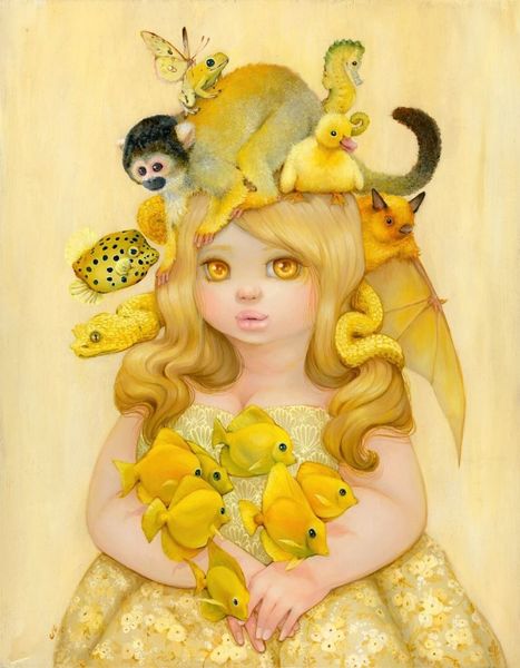 Camilla d'Errico created this striking image, "The Overworld & The Underbite" sometime in the 20th century. Immediately, one notices the painting’s pale palette, composed with soft edges and subtle gradations of color. This gives the artwork a dreamlike quality, emphasized by the large eyes and the otherworldly stillness of the central figure. The composition is structured by a contrast of textures. The smoothness of the figure's skin and hair is offset by the rougher depiction of the dogs' fur and the patterned ladybugs that adorn the figure’s head. The painting can be understood through the lens of structuralism and the semiotic system of signs, revealing an interest in the interplay between surface appearances and underlying structures. The use of pale hues and soft textures creates a sense of ethereal beauty, but the odd combination of elements prompts us to question conventional notions of harmony. In this way the artwork becomes a site for the re-evaluation of aesthetic standards, suggesting that art’s meaning is derived not just from what is represented but how that representation challenges fixed meanings.