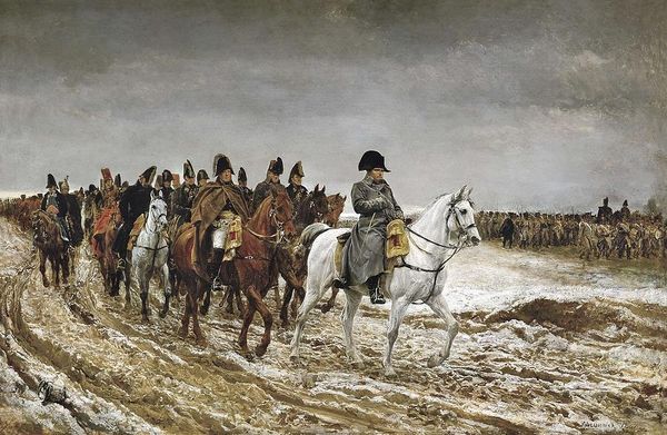 Emil Hünten's painting, "Giving the Orders," captures a moment of command amidst the theater of war. Hünten, born in Paris, and having served as a war artist himself, conveys the drama and tension inherent in military leadership. Consider how the figures on horseback dominate the foreground, their elevated position symbolizing authority and control. The central figure, with his outstretched arm, directs the movement of troops into the field of battle, reminding us of the power dynamics at play in times of conflict. Reflect on the human cost of such decisions, as soldiers march forward, their faces obscured, their individual identities subsumed by the collective effort. Hünten presents a traditionally masculine view of war and leadership that was common at the time it was painted. Ask yourself, what alternative narratives about war might be missing from this image? Perhaps those of women, civilians, or the conquered? As you reflect on this painting, consider the many stories that remain untold.