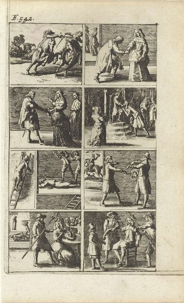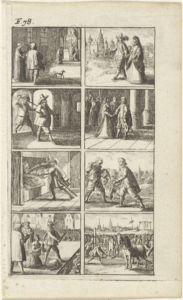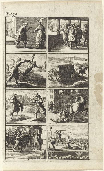 Editor: This is "Verhaal met voorstellingen van moord en doodstraf," made in 1667 by Abraham Dircksz. Santvoort. It's a print, an engraving. The starkness of the black and white and the subject matter make it very… intense. What jumps out at you about this piece? Curator: The overriding element in this print is structure, primarily how each of the eight scenes interact. Semiotically, consider the organization—a tight grid, yet within that framework, varying degrees of activity unfold. How does the linear quality shape your perception? Editor: I notice the consistent line work throughout, creating a visual flow even between violent acts. Does that suggest a specific reading, beyond just documenting these events? Curator: Precisely. The line's unwavering presence flattens the emotional landscape, abstracting violence into narrative form. Notice the absence of deep shadows or textural variation that might invite emotional response; instead, line dominates, thus directing your reading. Consider how the artist’s reduction shapes our understanding. Does the consistency neutralize or amplify? Editor: I initially thought it distanced me, but now I see that the constant style emphasizes that these are all parts of a similar story, linked in the same world with similar values about death. Thank you for sharing this interpretation. Curator: And thank you for guiding me towards seeing it in this fresh context, and the emotional connection formed with these simple linear images.
