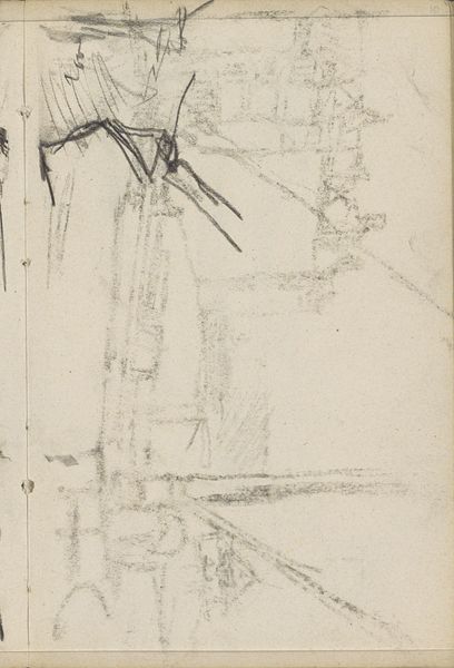 Curator: The hurried energy of this sketch is quite arresting. Editor: Indeed. Here we have George Hendrik Breitner’s "Bemande boot," or "Manned Boat," dating from 1883 to 1885. It’s currently held at the Rijksmuseum. What strikes you about its composition? Curator: The initial impact lies in its raw, almost anxious line work. Breitner captures the essence of form, employing the barest economy of means: a pencil and a piece of paper. The lack of detail begs questions: Who were these boatmen, what were the labor conditions, and where might they be headed? Editor: Structurally, notice how the prominent diagonals create a sense of instability. It guides our eyes across the paper, while the tonal variations, achieved solely through line density, suggest both depth and form. How would you interpret the mood evoked by these techniques? Curator: The very act of sketching reflects a specific moment in art production, one directly linked to the material conditions and social realities surrounding the scene's laborers. Breitner was known to frequent working-class areas, this wasn't about picturesque scenes but recording lives shaped by toil. Editor: Yes, but how brilliantly the essence of “boat” is distilled – the angle of the mast, the implied rocking. A few carefully placed strokes suggest a complex object. Are these quick notations more emotionally revealing than, say, a fully rendered academic painting? Curator: Without knowing who commissioned the work, it is impossible to state if that level of exploitation or labor practices was explored in detail here. Yet, its aesthetic decisions speak to Breitner’s interest in documenting aspects of the society in which he was entrenched. Editor: Perhaps we're each highlighting an essential function of this type of drawing: you, its context within the burgeoning urban landscape; and I, its power to render transient feeling and elemental form, but both intersect to give "Bemande Boot" an eternal sense. Curator: Well, seeing its production this way does shed an alternative light on the social dynamics embedded within this unassuming drawing, enriching how we relate with it in a contemporary context.