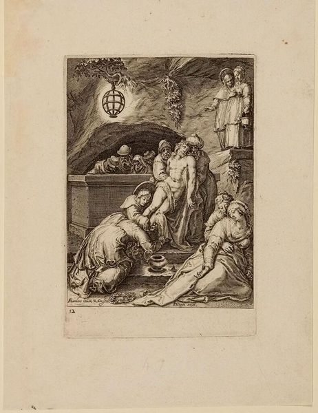 Curator: Here we have Zacharias Dolendo's "Christ in the Garden of Gethsemane." I'm immediately struck by the sense of quiet dread the artist conveys. Editor: Yes, the engraving's lines, so precise and controlled, give the scene a feeling of poised tension. What catches my eye is the density of the etching itself, the labour involved in creating this small plate, and how that effort mirrors the very toil depicted. Curator: It is fascinating how Dolendo uses the composition to draw our eye. The sleeping figures in the foreground create a strong diagonal, juxtaposed with Christ's solitary vigil and the beckoning angel. Editor: Exactly, and all this is achieved through a demanding process, the biting of the acid into the metal, each line deliberate. The materiality of the print connects us directly to the historical workshop. Curator: Looking at the overall structure, the light from the angel creates a visual contrast to the earthly realm. It is symbolic, setting up an opposition between divine intervention and human frailty. Editor: But also, the ink itself, the paper, they are the products of specific industries, reflecting a whole network of labor and commerce of its time. Curator: True, seeing it from both angles deepens our understanding. Editor: Indeed, it allows us to appreciate not only the final image, but also its origin and physical construction.