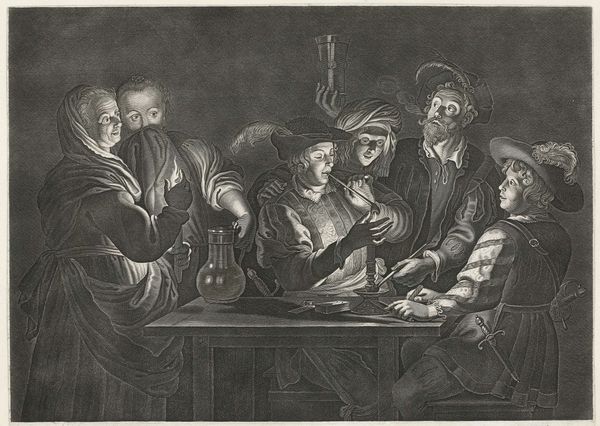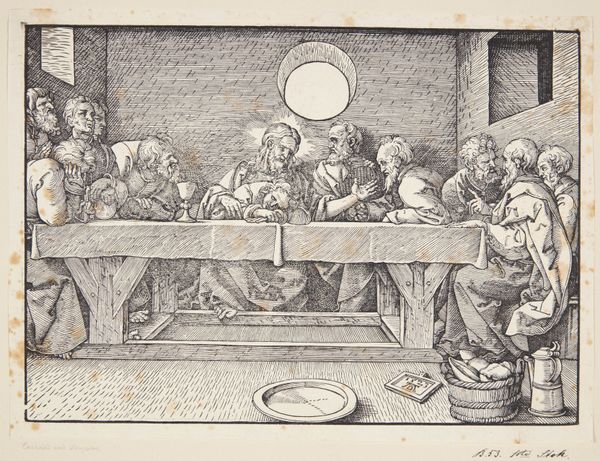 Editor: Here we have a 16th-century engraving, "The Last Supper," whose creator remains anonymous, part of the collection at the SMK. What strikes me immediately is its intense detail and the sheer number of figures squeezed into a single scene, the composition feels crowded but purposeful. How do you interpret this work, considering its historical context? Curator: That feeling of purposeful crowding is key. In the context of the Northern Renaissance, the detailed realism isn't just about accurate depiction. It's a means of conveying moral weight. The figures aren't just people; they're representations of faith, doubt, and betrayal, operating within a specific social understanding of religious narrative. Notice how the setting—the architecture, the table—becomes a stage for enacting religious doctrine. Where does the setting position the viewer within this moral play? Editor: I suppose it places us both as observers, witnessing a really intimate event as outsiders. I wonder about the symbolism? I see a lot of references, objects that surely meant a lot more back then. Curator: Precisely! That symbolic weight is crucial. The single plate on the floor. The arrangement of figures, a sort of staged moment where light seems to suggest importance. It invites the viewer to interpret how that setting participates in shaping faith during a time of religious and social upheaval. What's the relationship between the image and the viewer, within this landscape? Editor: It's amazing how a simple engraving can reflect the tensions and dynamics of its time, the personal struggles set against the background of bigger socio-religious factors. Curator: Indeed. Images weren't just pretty decorations. They played an active role in shaping cultural thought and defining social identities. What was simply consumed has much larger historical, cultural, and institutional meaning. Editor: I see it now, the power of images as active participants in shaping belief. Curator: And hopefully, now, you also see its reverberations across centuries of social discourse.