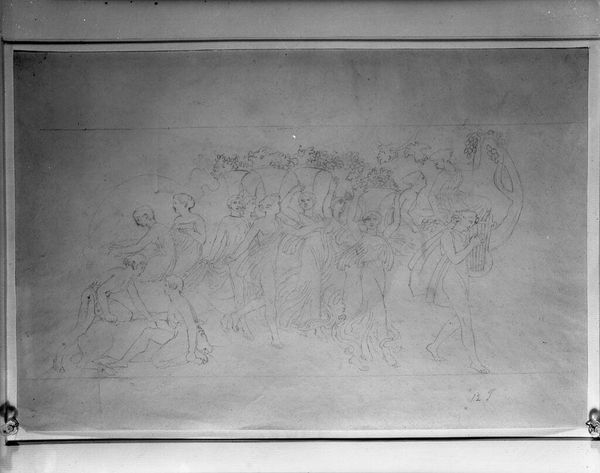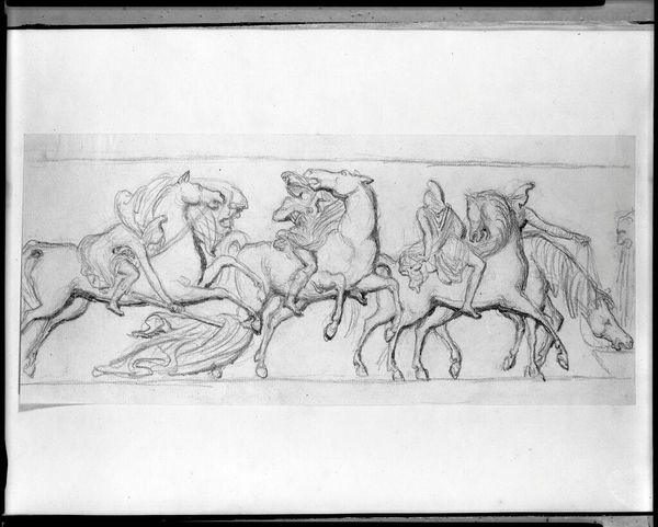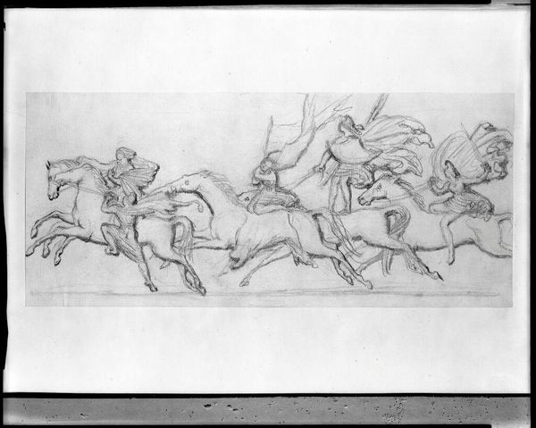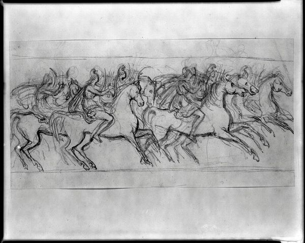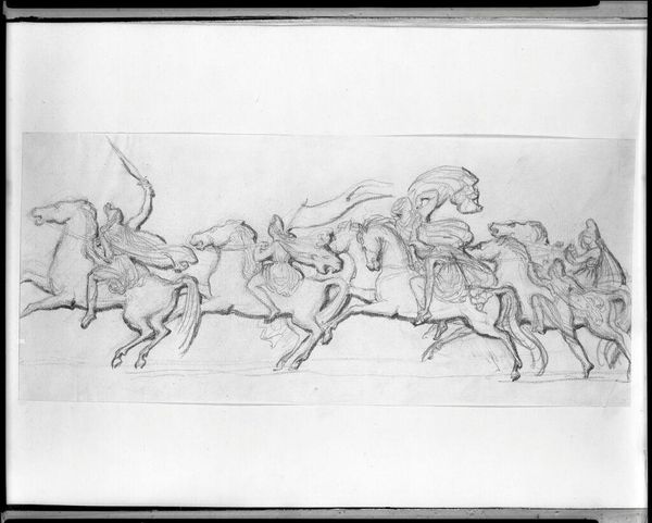 Curator: This drawing at the Harvard Art Museums is entitled "Amazons on Horseback" by Pierre-Jean David d'Angers. Editor: It feels like a quick sketch, but even in its raw form, it conveys a sense of fierce movement, like a scene ripped from an epic poem. Curator: David d'Angers was a master of capturing dynamism; the composition itself—the diagonal thrust of the horses, the overlapping figures—contributes to this feeling of unrestrained energy. Editor: I am immediately struck by the contrast of the figures; the horses possess a real muscular bulk, while the Amazons seem almost ethereal atop them. It makes the scene feel both grounded and fantastical. Curator: Precisely, it's as if he's exploring the tension between the real and the mythic, which is fitting considering the legendary status of the Amazons themselves. Editor: Indeed, it seems d’Angers succeeded in conjuring a vision of both power and poetry in this study. Curator: A remarkable testament to the power of preliminary sketches.
