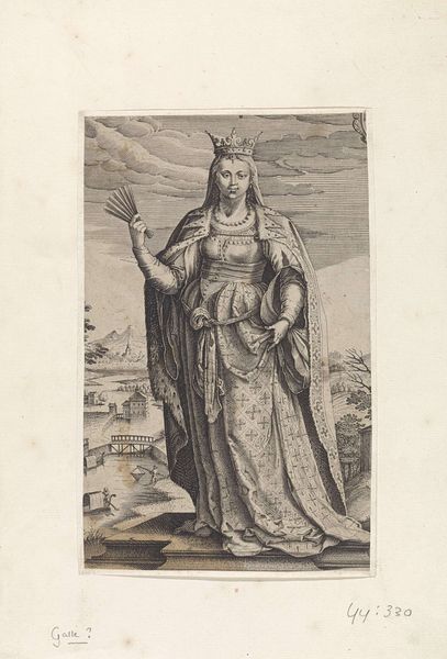 This is an engraving of French Judith, a print made by Abraham Bosse, sometime in the mid-17th century. Judith dominates the composition, standing tall with a sword in one hand and lilies in the other. The artist uses contrasting colors to draw our eye across the print. The red of her sleeves sharply contrasts with the green of her skirt, creating a visual tension that animates the figure. Notice how her body is subtly angled, creating a dynamic interplay of lines and shapes. The artist uses Judith as a signifier to engage with ideas about female virtue, power, and national identity. Her stance, dress, and the objects she holds, combine to create a complex symbolic language which places her at the intersection of religious narrative, social ideals, and political allegory. The formal qualities of this print, its composition, color, and line, invite us to consider how visual representations can construct and negotiate cultural meanings.