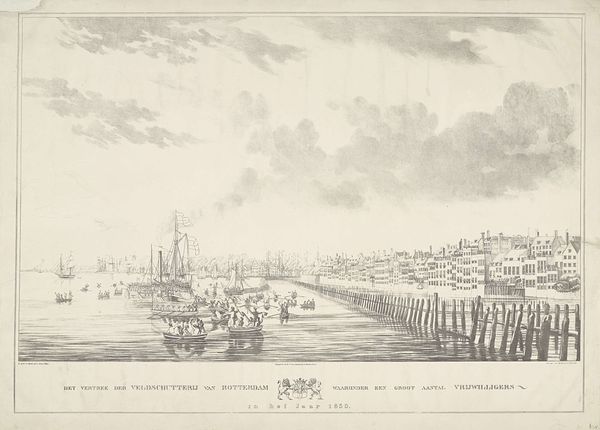 Hendrik Last created this print called "Gezicht op Rotterdam vanaf de Maas" using etching and engraving techniques. The dominant impression is one of bustling maritime activity set against the backdrop of Rotterdam's architecture. The city's skyline is rendered in precise detail, while the foreground is filled with boats, their forms reflected in the rippling water. Last's print employs perspective to guide the viewer's eye from the foreground action towards the more static buildings, creating a balanced tension between movement and stability. The artist has carefully composed the scene to capture the essence of Rotterdam as a vital trading hub. The use of etching and engraving allows for fine lines and tonal variations, creating a sense of depth and atmosphere. The visual elements combine to give the viewer an insight into the economic vitality and spatial structure of the city. The detailed representation invites us to decode the signs of commerce and urban life, offering a glimpse into the relationship between space and society.