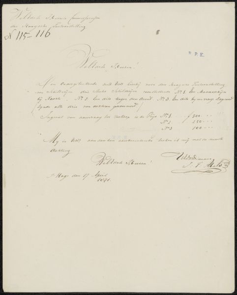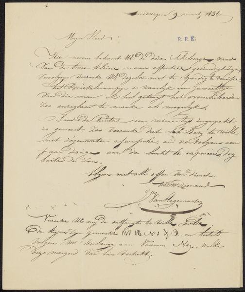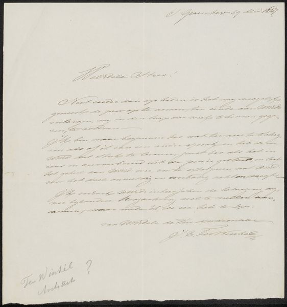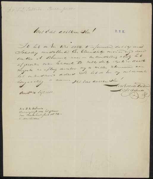 Curator: This captivating letter, "Brief aan anoniem," meaning "Letter to Anonymous," possibly from 1816, penned by Petronella van Woensel using pen and ink on paper, strikes me with its delicate, almost secretive nature. It's quite small. Editor: It definitely evokes a sense of intimacy and formality intertwined. The looping script, almost calligraphic, hints at a specific societal expectation, but I am left to question the intent behind choosing to keep the addressee a mystery. It seems charged with untold social and political implications. Curator: Exactly. Van Woensel was a woman in a male-dominated art world. Considering the period, this could be a plea for something; an expression of personal frustration masked by elaborate courtesy. Editor: Right, and this isn't merely a personal missive. Even correspondence has public roles and power dynamics woven into it. The elaborate address—the repeated "Well Beloved Sir"—immediately sets the tone of the interaction. I imagine that would situate Van Woensel within the constraints of proper decorum while possibly also negotiating influence or appealing to their benevolence, and the fact that it's not complete nor received highlights women’s writing in public and in art during this time. Curator: Certainly, she is performing a delicate dance. This drawing, this letter, becomes more than just a document. The aesthetic quality of the penmanship also elevated letter-writing into art, which gives agency to female voices and provides opportunities to build community. It speaks to resilience, persistence, and subtle resistance to the patriarchy. Editor: And by leaving the recipient nameless, the message becomes universal. Anyone facing injustice or seeking a voice could relate. Perhaps the 'anonymous' becomes symbolic of all marginalized voices during that time. I wonder, how can these forms of creative expressions build collectivity that still resonates in society today? Curator: Looking closely, what first struck me as secretive is perhaps also, as you suggested, strength and strategic defiance. Editor: It shifts our interpretation entirely. The art history allows us to explore a narrative where private writings act as expressions of social resistance to explore beyond just individual interpretations. Curator: Beautifully articulated. It reveals just how crucial historical context is for understanding not just art, but social change.