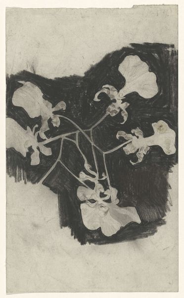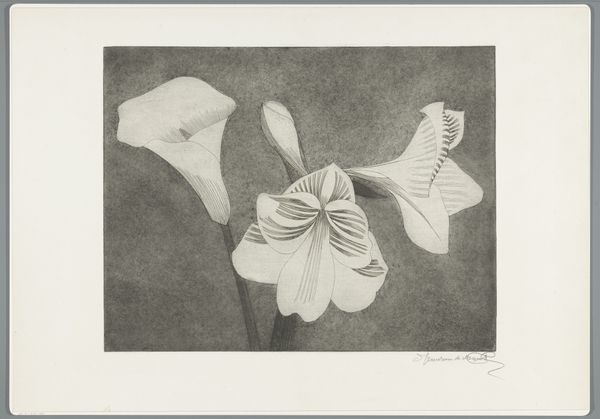 Editor: This is Jeannette Maxfield Lewis's "Callas" from 1959, an etching print. It feels very graphic, stark even. All those carefully placed lines create such a sense of depth, especially with the dark background. What do you see in this piece that I might be missing? Curator: Immediately, the complexity of line becomes apparent. Observe how Lewis uses varied densities and directions of etching lines to sculpt form and light. The lilies themselves, and the vase especially, gain volume from the considered arrangement of marks, achieving both descriptive accuracy and an overall decorative aesthetic. Note the interplay between positive and negative space—the black background pushes the subject forward. Editor: I can see that, the lines around the vase are incredible! Almost chaotic but creating real form. Is that intentional do you think, or is it simply to create form? Curator: One could argue that chaos is intentionally evoked to amplify form, or conversely, form arises naturally out of chaotic linework. Is there a way to truly differentiate when viewing it? Editor: That’s true, it could be both I guess. Thinking about it, the title focuses my attention towards the flowers too; away from background which becomes a frame in turn. It shows the strength of simple design doesn't it. Curator: Precisely. Lewis manipulates these formal elements to evoke, not merely represent. Consider how your own interpretation is guided, challenged, and enriched by attending to this level of structural articulation. A potent piece, isn’t it? Editor: It really is! I never noticed how much detail etching allows; it certainly focuses the mind, thank you!