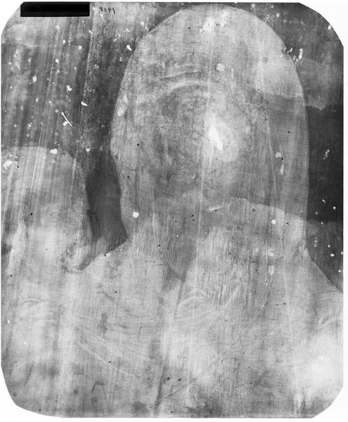 Editor: This is an X-radiograph of "Laura," originally by Giovanni Bellini. It's fascinating to see beyond the surface of the painting; it’s almost like looking at a ghost. What secrets do you think this reveals about Bellini's process? Curator: It's like an archeological dig into the artist's mind, isn't it? You see those lines? They trace the life of the wood panel itself, but also the build-up of paint layers. It hints at changes Bellini made, a whisper of his artistic decisions. Makes you wonder what he was thinking, doesn't it? Editor: Absolutely. It’s like seeing the painting’s skeleton. So much more than just the final image. Curator: Exactly! It's a reminder that art is rarely a single, spontaneous act, but a journey. That even the most masterful works hold hidden stories beneath the surface.