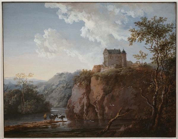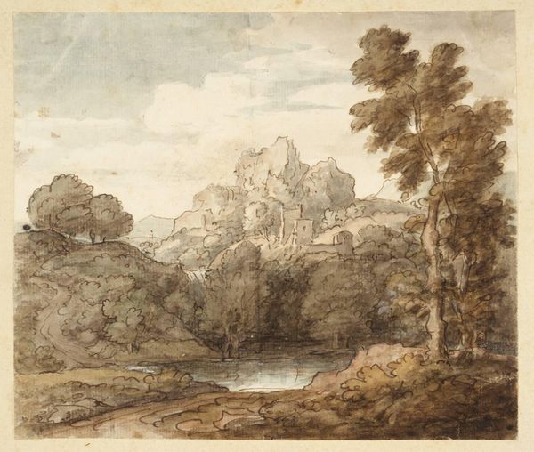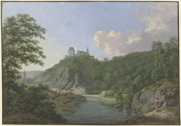 Editor: So, this watercolor drawing is called "View of Chepstow, Wales." John Scarlett Davis created it in 1834. It’s currently at the Metropolitan Museum of Art. It gives me a bit of a nostalgic feeling, looking back at the landscape. What catches your eye in this piece? Curator: Nostalgia's a good word for it. For me, it’s that gentle push and pull between reality and feeling, very characteristic of Romanticism, that strikes me. The meticulous details of the architecture are almost photographic. Davis gives the impression of a town steeped in time and grandeur. Almost feels like you could reach out and pluck it from history. What do you make of the color palette? Editor: It seems very subdued. It feels like everything is fading a little into the distance, both the town and the natural landscape, especially the water. Curator: Exactly! That's the romance creeping in. Consider that subtle washes allow for depth. This muted palette doesn’t just depict Chepstow; it evokes the emotional atmosphere. Did you notice how he uses the varying textures, from the softness of the trees to the firm rocks? What thoughts does it conjure up? Editor: It makes the image feel really alive, almost like I'm there on that overlooking hill feeling the air on my skin. It highlights, for me, the contrast between nature's enduring strength and how human constructions kind of blend in with it all over time. Curator: Precisely. It makes you wonder what narratives, what hidden stories, might reside in those distant houses and riverbeds. Art invites us to step outside ourselves, doesn't it? I appreciate the new perspective. It makes one imagine this Wales depicted by Davis and, hopefully, it will still be here after we all are gone. Editor: It was such a rich look into a captivating artwork! Curator: Agreed! It’s those layered experiences that makes the old fresh, don’t you think?
