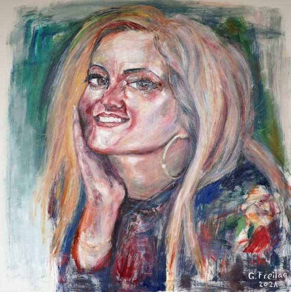 Curator: Gazmend Freitag painted this portrait of Vjosa Osmani in 2021. The medium looks to be oil paint on a square canvas. Editor: My initial response is… striking! The loose brushstrokes give the piece a modern feel, yet there's something classical in the composition. The colour palette feels very contemporary. Curator: Freitag is a contemporary artist, and this portrait very much situates itself in the lineage of formal portraiture. Consider how portraits, throughout history, have often served to solidify power and status. Given Osmani’s position, how might this painting engage with that history? Editor: I see it as a conscious choice to place her within, and perhaps critique, that legacy. Osmani, as a female president, challenges traditionally male-dominated power structures. The vibrant colours and brushstrokes almost democratize the image, making it more approachable. Curator: That’s an interesting point. The light blue backdrop also departs from the somber, darker tones often associated with traditional political portraiture, imbuing the work with a more youthful feel. We need to remember too, the very public role of artists and intellectuals during Kosovo’s struggle for independence and state building. Editor: Exactly. The red blush on her cheeks, the direct gaze, the subtle smile… It's intimate, and speaks to a vision of leadership that isn't authoritarian or detached, but connected and aware. Is the direct address in her eyes reflective of how Freitag regards female authority in formerly oppressive patriarchal cultures? Curator: Freitag is undoubtedly making a statement, one that speaks to contemporary shifts in power dynamics and representation. The artist uses oil paint in a way that celebrates this particular public figure in Kosovo’s post-war historical narrative. It is very different than how public figures were represented in the Yugoslavian era for example. Editor: Well, this painting offers a rich intersection of history, politics, and artistic expression. It definitely prompts crucial discussions around identity and power in the contemporary political landscape. Curator: Indeed. It makes us question who gets immortalized through portraiture and what that means in a constantly changing world.