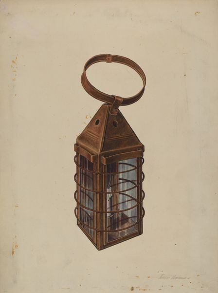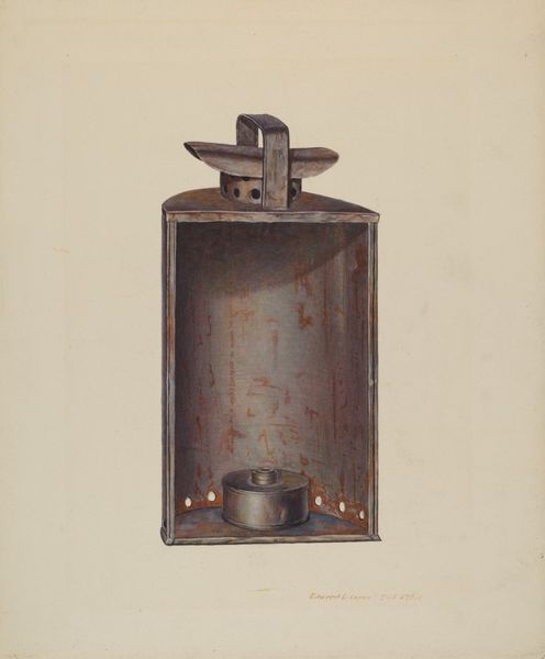 Editor: So, this is Orville Cline’s "Zoar Candlestick, Snuffer and Lantern," circa 1938, rendered with watercolor and charcoal. There’s almost a clinical, catalog-like quality to the arrangement of these everyday objects. What stands out to you in this piece? Curator: The mundane nature of these items, presented with such deliberate attention, speaks volumes about the values of the Zoar community. They were a German Separatist group seeking religious freedom and self-sufficiency in America. It wasn’t simply about utility; these objects embody a lifestyle choice rooted in communal living and piety. Editor: That’s interesting, so you see the arrangement as a social commentary of some kind? Curator: Exactly! Consider the time period, right? The late 1930s – the Depression era, with its intense social inequalities. Cline's depiction can be seen as a quiet assertion of Zoar's alternative approach, a world apart from the rampant consumerism of mainstream society. These simple tools, elevated to art, become a political statement of sorts, highlighting self-reliance in contrast to a failing economic system. What does this evoke for you? Editor: The intimacy and functionality…perhaps it reflects on how necessary these items are? How these were viewed then versus now. It almost pushes you to think how simpler living equates to a closer connection to what matters in society. Curator: Precisely! Cline prompts a reevaluation of our own relationship with material goods and the values they represent. It's an intersection of art, history, and a gentle call to question our own societal structures. Editor: Thanks so much for that. I didn’t realize so much could be packed into this simple work! Curator: Absolutely! The political often hides in the everyday. I learned something today too!