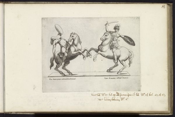 This is a pen and ink drawing by Johannes Tavenraat, featuring various sketches of horses, a rider, and a landscape with a farm. The horse, throughout history, has been a symbol of power, freedom, and nobility, and is a recurring motif that transcends cultures. Here, the rearing horse embodies vitality, evoking memories of similar powerful depictions, such as those found in ancient battle scenes. Consider the steeds in Paolo Uccello's "The Battle of San Romano," where the horse is also emblematic of chaotic energy and martial prowess. The horse falling on its back, however, disrupts this ideal, hinting at vulnerability or loss of control. The rider smoking a pipe on horseback evokes a sense of contemplation, contrasting with the wild energy of the other horses. Such juxtaposition invites us to reflect on the interplay between control and instinct, a dance as old as human civilization itself.