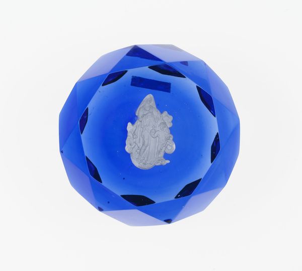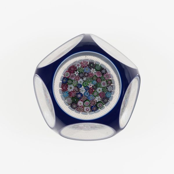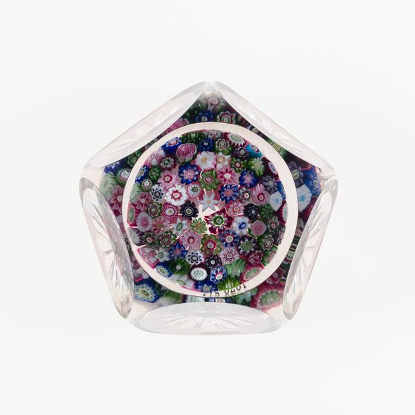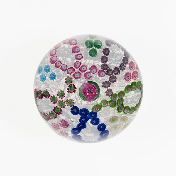 Curator: This is a nineteenth-century glass paperweight, attributed to the Compagnie de Saint Louis. It’s currently part of the Art Institute of Chicago’s collection. Editor: It's beautiful! The floral design suspended within the clear glass reminds me of a captured moment, preserved for eternity. There is a certain Victorian sentimentality about it. Curator: Precisely. Consider the techniques involved in its manufacture; layers of molten glass, carefully manipulated. What strikes me is how this everyday object elevates labor and the hand-made at a time when industrial processes were beginning to dominate. Editor: The popularity of paperweights speaks volumes about the rise of literacy and bureaucratic culture in the 19th century. Paper ephemera demanded order, demanding containment and control. This otherwise functional item is reimagined, becoming a miniature monument, a celebration of leisure. Curator: These objects offered artisans a canvas for complex skills and innovative techniques, particularly in glassmaking. These artisans negotiated boundaries between craft and fine art. This involved carefully controlling heat and timing in their furnace-based labor, and choosing materials for specific colors. Editor: How do you see it relating to contemporary artistic practices that also examine the use of industrial materials and elevate functional objects? Curator: This piece could inspire many of our artists. If you think of the Pattern and Decoration movement of the 1970s that rebelled against minimalist art. Or you think of contemporary design practices focused on reuse and subversion. There is so much possibility to reimagine what beauty can be. Editor: Agreed. It’s also interesting to think about its presence in the museum context. How does displaying an item like this in an institution devoted to art impact its status and meaning? Curator: It invites audiences to ponder and re-examine their perceptions of everyday items. To notice, value, and appreciate the material labor involved in even the humblest item. It bridges gaps between utility and pure artistry. Editor: Exactly. Well, I’ve definitely gained a new appreciation for paperweights! Curator: Me too, and hopefully our listeners will as well.
