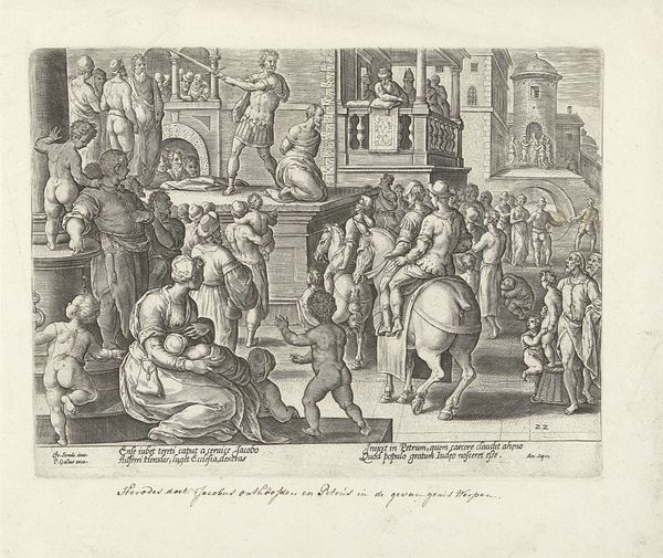 Editor: This print, "Drie jongelingen in de brandende oven," made sometime between 1582 and 1613 by Pieter van der Borcht I, is an engraving, full of tightly packed figures and architectural details. It feels…theatrical, almost staged. What historical narratives do you see at play here? Curator: Well, beyond the immediate biblical narrative of resistance to tyranny, I'm struck by how the image itself becomes a stage for exploring themes of religious and political defiance within the context of the Northern Renaissance. Consider how the classical architecture might represent an oppressive power structure, against which these "jongelingen" stand. Where do you see visual cues about class or gender in this image? Editor: I see men being thrown into the furnace. Is there any symbolic value attached to the three men’s survival amidst the fire? Curator: Absolutely. Their survival can be interpreted as a potent symbol of resilience against oppression and injustice. It resonates with marginalized communities throughout history and even today, those who have faced persecution for their beliefs or identities. The flames are a kind of trial or crucible… are they purified, or simply martyred? Editor: So, you’re saying this isn't just a religious scene, but a commentary on resisting unjust authority, one that could also apply to, say, gender or racial power dynamics? Curator: Precisely! Art, particularly historical prints like this, invites us to consider how power operates within society. It's fascinating to see the dialogue between this historical work and contemporary concerns. Editor: That's incredible, I didn’t think of it that way! Curator: Thinking about it now, it shows us how historical art remains incredibly resonant and gives context to the fight for freedom. Editor: Exactly! It’s helpful to consider a broader picture when viewing art. Thanks!