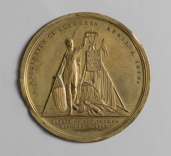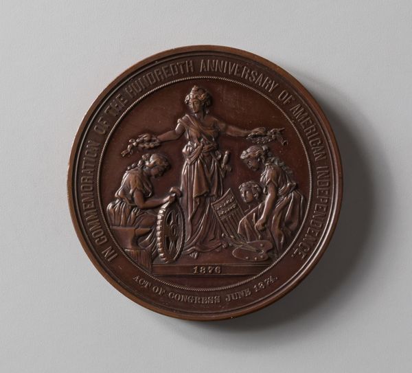 This gilded metal medal, designed by William Barber, commemorates the Philadelphia Centennial Exhibition. The composition is arranged in a circular format, a common structure for medals, which here invokes a sense of completion and unity. Look closely at the relief. Three figures anchor the design. A central allegorical female figure, possibly representing Liberty or Progress, stands poised with open arms. Flanking her are two other female figures engaged in activities representing industry and the arts. The crisp, precise lines of the figures and machinery contrast with the smoother, more flowing drapery, creating a dynamic tension within the small space. This medal uses a visual language deeply embedded in classical and neoclassical traditions. The semiotic system at play communicates values of progress, industry, and artistic achievement that were central to the American identity at the time. Its circular form not only contains these images but also suggests an ongoing, cyclical view of progress and commemoration.