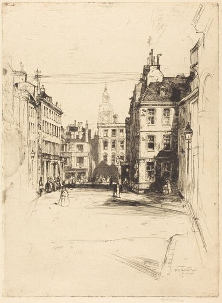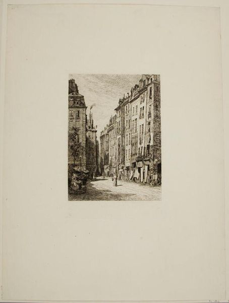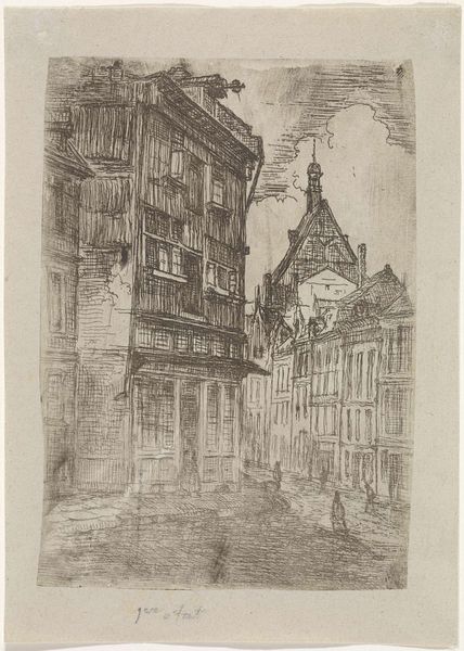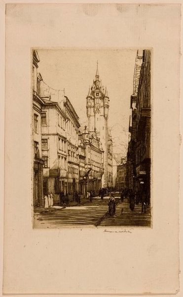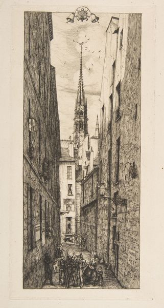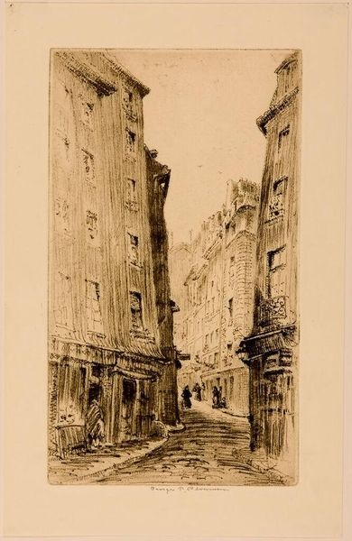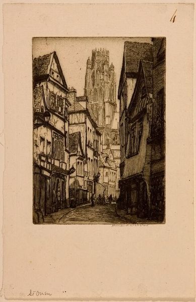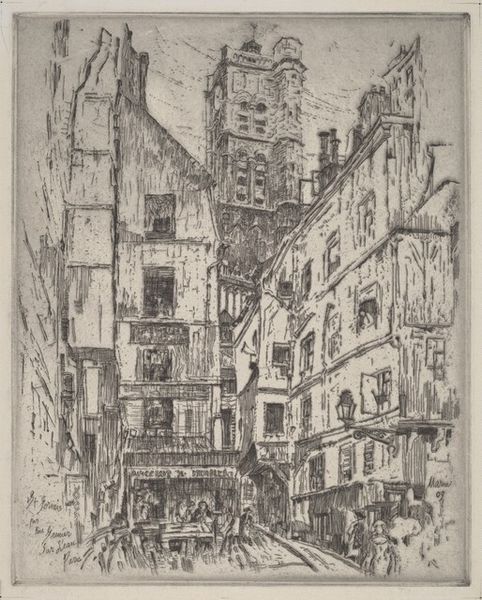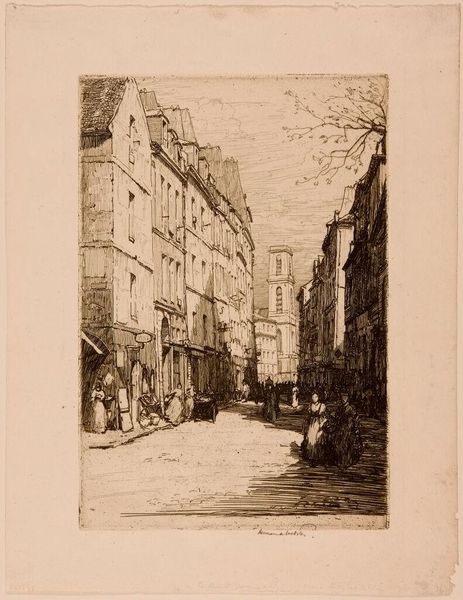 Editor: This is Herman Armour Webster’s etching, *Rue Grenier sur l'Eau, Paris*, housed at the Harvard Art Museums. It’s a cozy scene, a narrow Parisian street that leads the eye right to a church tower in the distance. What strikes you about it? Curator: It's a masterful use of line, isn’t it? Webster captures the essence of old Paris with such delicate precision. I almost feel like I can hear the echoes of footsteps on those cobblestones. The way he uses light and shadow, it's as if the buildings are breathing. Does it remind you of other artists or movements? Editor: Now that you mention it, it does remind me a little of some impressionist paintings that I've seen. Curator: Yes, but with a twist. Instead of blurry strokes, we have this intricate network of lines. It’s as if he's building the scene from the ground up, layer by layer. What do you think about the tower in the background? Editor: It looms quite large in comparison to the surrounding buildings. Curator: And yet, it feels perfectly at home. Webster’s managed to find the soul of Paris in this quiet little street. Editor: I never would have noticed the detail without our conversation!