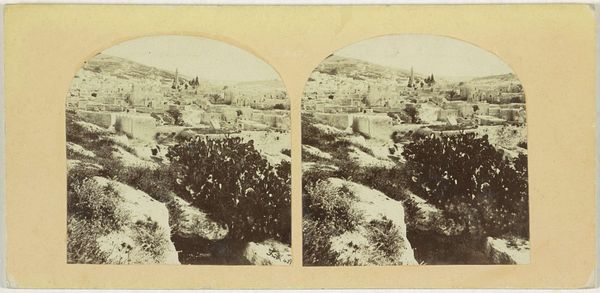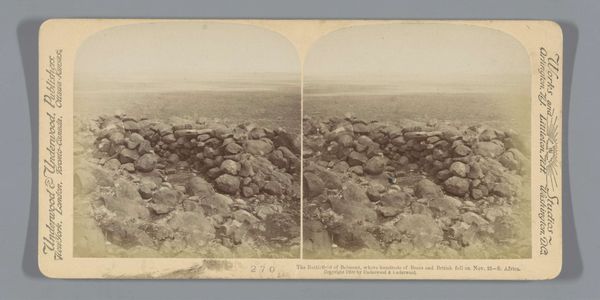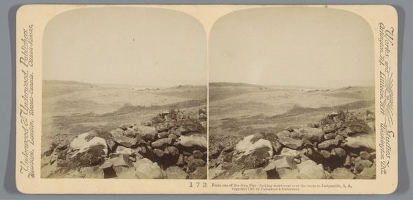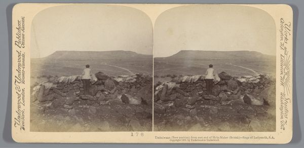 Curator: This is a stereograph by William Bell, documenting the Sevier River Valley south of Gunnison, Utah. Editor: It certainly conveys a palpable sense of isolation. The monochrome palette and distant vista create a mood of stark contemplation. Curator: The composition is intriguing; the sharp foreground rocks give way to the valley and hazy mountains, organized into clear visual planes. Editor: And we should consider the context of 1872—this landscape was undergoing profound transformation due to westward expansion, impacting indigenous communities and ecologies. It is important to acknowledge that these seemingly empty landscapes are not neutral. Curator: Yes, the photograph is imbued with the ideology of Manifest Destiny. The two figures perched on the rocks reinforce a theme of discovery and dominion. Editor: This is a reminder of the violence inherent in claiming "unexplored" territories. The quietness we observe masks a history of dispossession. Curator: Looking at the tonal range and contrasts, I am still in awe of the level of detail Bell achieved with photography. Editor: Which raises questions about whose perspective is privileged. This image serves as a potent reminder of how landscape photography can be both beautiful and deeply implicated in sociopolitical narratives.