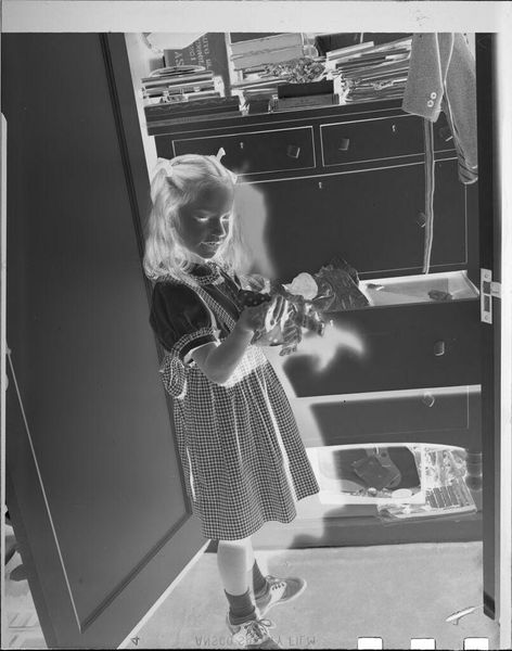 Curator: This photograph, "Untitled (girl on rocking horse)," comes to us from the collaborative work of Lucian and Mary Brown. It's a gelatin silver print. Editor: It feels so immediate, so joyful. The girl’s expression – pure, unadulterated glee. A lovely snapshot of childhood. Curator: The rocking horse itself is an interesting motif – a symbol of play, but also of contained energy. It suggests both freedom and limitation, which is quite potent when you consider the societal expectations placed on young girls, even unconsciously. Editor: I suppose. For me, though, it’s just a moment perfectly captured. Look at the slight blur, the composition with that packed bookshelf in the background--it gives me a pang of nostalgia. Curator: The domestic objects in the background certainly root this image in a specific cultural context. They speak volumes about family life and values. Editor: It's fascinating how a simple image can evoke such different responses, isn't it?