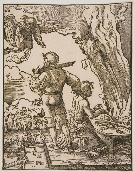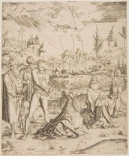 Curator: This engaging woodcut, "Theuerdank Endangered by a Violent Storm," was created by Hans Schäufelein around the early 16th century. Quite a dramatic scene! Editor: Indeed. My first thought is the vulnerability captured. The storm, rendered with such frantic lines, feels like an external manifestation of internal turmoil. Curator: It's part of a larger series commissioned by Emperor Maximilian I to showcase his prowess and courage. The storm, then, is perhaps a metaphor for political or personal strife. Editor: Absolutely. And the figures huddled in the boat—their reactions so varied, from fear to defiance—speak to the different ways people navigate crises, often reflecting power dynamics. The work seems rife with precarity. Curator: I find the detail of the landscape fascinating. The sharp, almost brittle lines suggest a world on edge, mirroring the emotional state of the figures. Editor: Thinking of environmental justice, the scene raises questions about who is most vulnerable to these storms, both literally and metaphorically, then and now. Curator: It makes you consider, doesn't it? The anxieties depicted are surprisingly relevant centuries later. Editor: Precisely. The artwork serves as a stark reminder that even in times of turmoil, art can illuminate shared humanity.