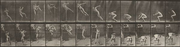 Plate Number 153. Jumping, running straight high jump, by Eadweard Muybridge captures a series of movements through chronophotography. In the late 19th century, Muybridge sought to dissect motion, driven by both scientific curiosity and perhaps a desire to exert control over the unruly, unfixed world. This work reflects the Victorian era's fascination with categorizing and understanding the human body. The photographs also reveal a gendered and racialized dimension, as Muybridge frequently photographed nude or semi-nude male bodies, often athletes, reinforcing notions of white, male physical prowess. The depiction of the male body is laid bare for study, as both a symbol of power, and a body to be disciplined. The work invites us to reflect on how bodies are historically placed under surveillance, studied, and often judged, in order to either maintain traditional norms or develop alternative narratives. It captures an enduring quest to comprehend and control the human form, which reflects societal ideals and power dynamics.