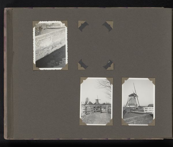 Curator: This gelatin silver print, titled "Rotterdam!", dates from between 1940 and 1946 and resides here at the Rijksmuseum. It's credited to an anonymous photographer. The work comprises three photographs arranged on what appears to be a scrapbook page. Editor: Well, it hits you right away, doesn't it? The bleakness of it all. Those burnt-out buildings look like charcoal drawings against a grey sky. Like a city after a bad dream. It's raw, and feels… personal, somehow. Curator: The contrast between the ruined cityscapes and the seemingly casual arrangement hints at a tension between the desire to document objectively and the impossibility of remaining emotionally detached. The use of monochrome reinforces the sombre tone. Editor: It’s that handwritten "Rotterdam!" scrawled below the pictures. It adds a strange sort of… celebration, I guess? Even in devastation. Makes you wonder if it's triumphant or tragic, or just defiant. Curator: Indeed. The photographs themselves function almost as metonyms for the experience of war—fragments of a larger, catastrophic event distilled into portable, manageable images. Editor: There’s something so human about it being in what seems to be an old photo album. I picture someone flipping through these, remembering what was, seeing what is. A kind of quiet elegy to resilience, you might even say. What it must've felt like holding these memories… Curator: The composition forces a triangulation between the ruin, the observer, and the viewer. Editor: What remains, though, are questions about memory, loss, and humanity's ability to simultaneously destroy and create. This artist captured so much within a series of modest prints. Curator: A poignant visual document offering layered meaning. Editor: Quite so, very poignant indeed.