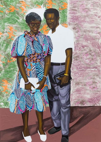 Editor: This is "Women Affairs," a 2022 acrylic painting by Cornelius Annor. It feels like such a tender portrait. What immediately grabs me is the artist's choice of color and pattern, contrasting so strikingly with the figures' skin tones. How do you interpret this work? Curator: It's fascinating how Annor uses those contrasts to speak to cultural memory. Notice how the textile patterns echo traditional African designs, suggesting heritage and identity. Consider the cultural weight of cloth – in many societies, it signifies status, history, even familial bonds. What do these fabrics tell us about the figures’ place within their community, do you think? Editor: That makes me think about how clothing and setting here tell a story about identity. They are in a domestic setting, but are elevated somehow. Is it fair to see those patterned fabrics and the poses as carrying layers of personal and cultural meaning? Curator: Precisely! The patterns could be read as a visual language, communicating narratives about womanhood, family, and social roles across generations. The pose, the touch – these intimate gestures speak volumes. Is there a sense of pride in their presentation? Is there strength? Editor: Yes, it's like the painting uses these symbols – the textiles, the pose, even the room – to create a multi-layered story. Curator: Indeed, and Annor seems to be tapping into a powerful well of cultural symbolism to portray the intricate tapestry of women's lives, not only now but in history as well. The "affairs" alluded to are less a literal plot and more an invocation of generational continuity. Editor: That is a really great consideration to think about! Thank you for illuminating all the rich symbolism within "Women Affairs.” Curator: My pleasure! Considering the weight symbols can have allows us to see the depth in works like this.