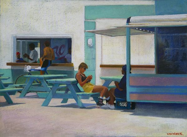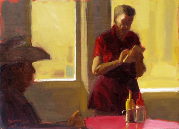 Nigel Van Wieck created this painting of a cafe scene in the 20th Century. The 'EXIT' sign above the doorway bears a peculiar weight. It's not merely a marker of physical space, but a symbol that speaks to our deeply ingrained awareness of life's transitions. Consider, for example, depictions of the soul's journey, often visualized as a passage through doorways or archways in ancient Egyptian art. The exit, the departure, the leaving behind, these are universal themes that surface time and again, signifying not just an end, but the anticipation of what lies beyond. Think of Charon ferrying souls across the River Styx, guiding them towards the unknown. Here, Van Wieck presents a modern-day threshold, a place where one narrative ends and another begins, stirring in us a primal recognition of change and the ever-present pull of the future.