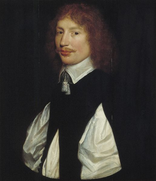 Curator: The oil painting before us, created between 1616 and 1700, is a portrait of William Russell, later the 1st Duke of Bedford, by Anthony van Dyck. Editor: The sheer darkness is what first strikes me. All that velvet… you can almost feel its weight, the intense black swallowing light and texture. It’s a dramatic presentation, bordering on melancholic. Curator: It is Baroque in style, known for its opulence and theatricality. This somber tone could reflect the historical weight of nobility during a period of intense political upheaval, don't you think? Editor: Perhaps, but look closely at the fabric. Van Dyck wasn't merely representing nobility; he was expertly rendering the very material of wealth and power. The skill in portraying velvet like this requires an intense engagement with materiality, turning paint into something tangible. Curator: That's very true. Velvet has long carried associations of luxury and status. Notice too how Van Dyck uses symbols – or rather, perhaps *omits* them. There are no overt signs of office or battle prowess. Instead, we have a direct gaze, a delicate hand gesture… Editor: Yes, that carefully posed hand. What about the social labor of such detailed work, however? How long did it take, how many brushes? Who made that collar? Art isn’t simply conjured. Curator: Good point! Those details contribute to a larger understanding. The lace collar, the cascade of brown hair – they aren’t merely aesthetic choices. They convey a cultivated, idealized version of masculinity intended to project a family's refined status across time. It represents more than just Bedford himself, it touches on continuity. Editor: Exactly, continuity preserved in paint and meticulously constructed through many people’s labor and through access to these precious textiles, themselves products of particular economies and trades. Curator: Considering all that, what an enduring image, though. Editor: Yes. It really does compel one to consider all the hands and resources it took to create such a piece.