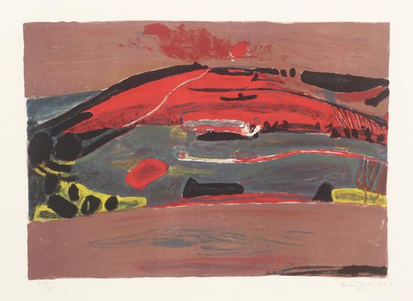Curator: Edvard Munch's "Melancholy III," currently residing at the Harvard Art Museums, presents us with a fascinating study in form and color. Its compact dimensions belie the depth of its emotional impact. Editor: It's like staring into a burnt sunset… or maybe a really bad bruise. The texture itself, so coarse, almost amplifies the feeling of unease. Curator: Indeed, the horizontal striations, visible across each of the three distinct registers, work to flatten the pictorial space. Note the tension between the fluid lines of the shoreline and the rigid woodgrain. Editor: I'm drawn to the silhouette on the right… is that a head in profile? It's so subtle, almost lost in the wood. It adds a layer of human solitude to the landscape. Curator: Precisely. The figure, barely discernible, becomes an integral part of the composition, embodying the very melancholy the work aims to convey. Editor: Ultimately, it's a powerful image, this strange puzzle of wood and sorrow. It feels like a raw, unfiltered glimpse into Munch's mind.