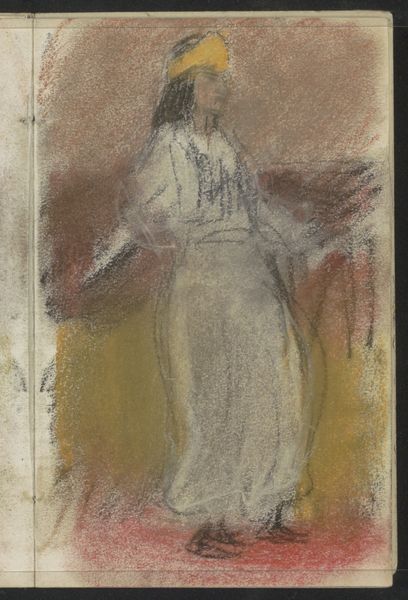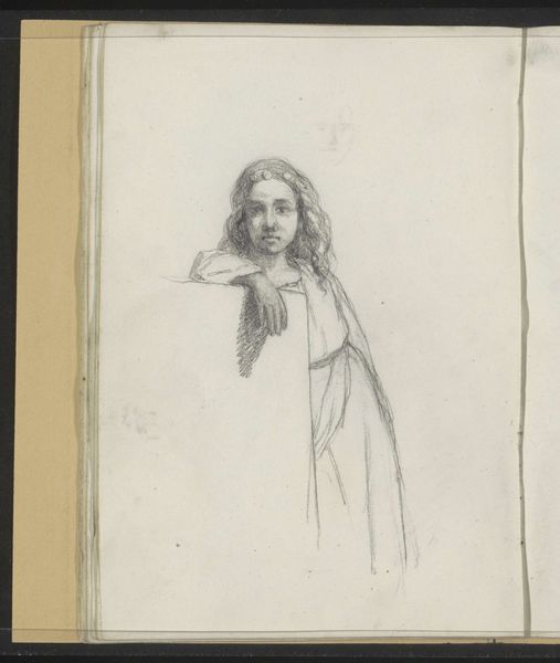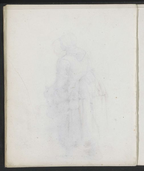 Editor: So, this pencil drawing is called "Abklatsch van de potloodtekening op pagina 11 verso," dating from between 1834 and 1911, by Jozef Israëls. It's currently held at the Rijksmuseum. I'm immediately struck by how faint it is, almost ghostly. What do you make of it? Curator: The spectral quality you notice is significant. It invites us to consider the ephemeral nature of memory and representation. The woman seems veiled not just by fabric, but by time itself. Do you notice how the artist uses the medium – pencil – to evoke a sense of fragility? Editor: I do, it’s as if she might fade away completely. Is the veiling symbolic? Curator: Absolutely. Throughout art history, veils have served as powerful symbols – concealing, protecting, suggesting hidden truths. What cultural associations does this imagery evoke for you? Think about societal roles of women in the 19th century. Editor: Perhaps modesty or mourning? I guess it speaks of repression too? Curator: It touches on all of those things, yes. Consider also the *act* of drawing as a means of preserving something, perhaps from oblivion. Israëls is imbuing the sketch itself with symbolic weight. What sort of untold stories do you imagine might lie within? Editor: That’s an interesting approach; the symbol extends to the artmaking process itself. It’s really given me a lot to think about. Curator: Indeed. A seemingly simple sketch reveals layers of meaning once we begin to unravel its symbolic language.
