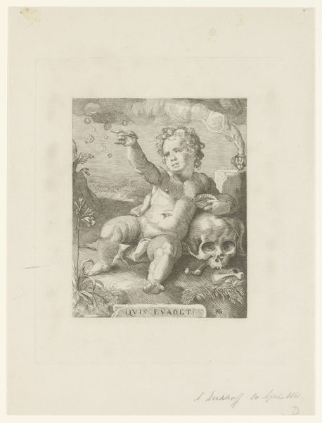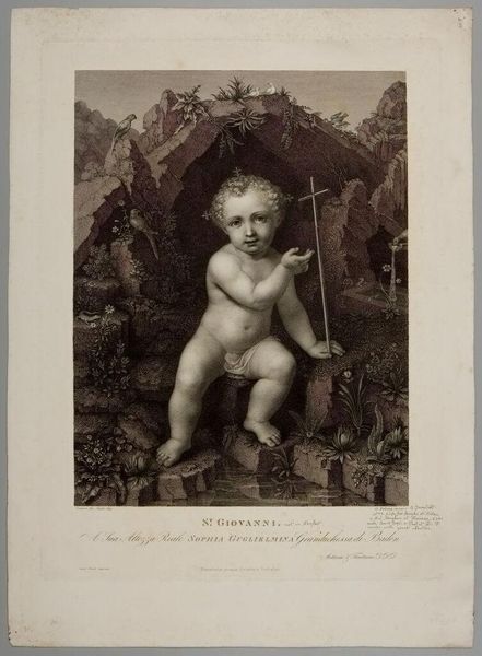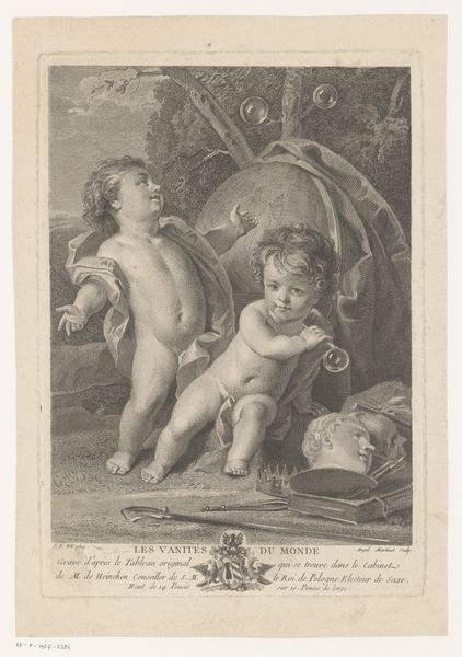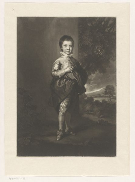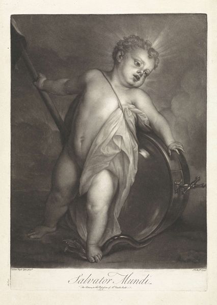 James McArdell created this mezzotint titled 'Christuskind als Salvator Mundi', sometime between 1729 and 1765. Notice how the composition centers on the figure of the Christ Child, who dominates the space with an almost sculptural presence. The stark contrast between light and shadow enhances the textures of the child’s skin and the draped cloth. McArdell employs a sophisticated tonal range, characteristic of the mezzotint technique, to create a rich visual experience. The background, a blend of natural and divine elements, is rendered with a softness that contrasts the sharp, almost hyper-realistic depiction of the child. The cross in the child's hand and the orb at his feet are not merely symbols but structural components that add to the complexity of the image. The semiotic interplay here invites us to consider how symbols function within artistic and cultural contexts. The contrast between the child's vulnerable, human form and the powerful symbols of salvation suggests a destabilization of traditional religious iconography, offering new ways of interpreting power, innocence, and divinity. This piece remains a powerful example of how formal qualities can inform deeper philosophical reflections.