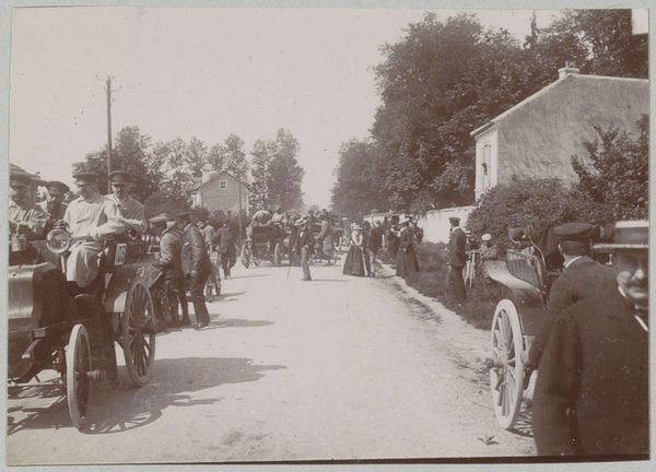 Editor: This is a photograph titled "Ossen slepen automobiel met pech op een landweg, vermoedelijk in Midden-Frankrijk," or "Oxen towing a broken down car on a country road, presumably in Central France," taken in 1899. It's a gelatin silver print. What strikes me is the stillness in the scene despite what seems like a frustrating situation. What are your thoughts on it? Curator: I would begin by observing the formal structure. Note how the artist uses light and shadow to create depth, dividing the image into distinct planes: the foreground with the oxen and car, the middle ground with the figures, and the background dominated by the soft focus of the trees. The tonality overall is quite muted, contributing to the serene quality that you've mentioned, despite the potential narrative tension of the breakdown. What effect does this monochromatic palette have, do you think? Editor: It feels timeless. Without the car, it could almost be a scene from centuries earlier. Is the juxtaposition of the modern car and the traditional oxen intentionally jarring? Curator: It's intriguing to consider this photographic print as a study in contrasts. The horizontal orientation of the landscape is echoed in the line of the oxen, automobile, and figures, yet there's also a distinct verticality created by the trees. The eye is drawn back and forth between these visual elements, leading one to reflect on the evolving relationship between technology and nature, industry and agrarian life. The materiality of the gelatin silver print itself becomes a part of the image, subtly emphasizing the textured surface and creating a delicate interplay between representation and object. What are your impressions now? Editor: That’s fascinating. I see how the structure and tonality emphasize that tension and create a beautiful, albeit unexpected, harmony. I had initially seen the photo only at face value. Curator: Exactly. By examining the intrinsic visual language, we unlock a deeper appreciation of the artwork's meaning. There is often so much more to photographic art than what meets the eye initially!
