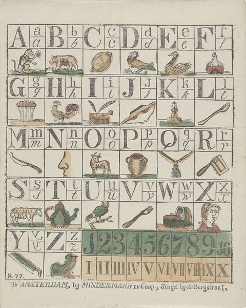 Curator: Walking through the Rijksmuseum today, we find ourselves face to face with "Deez' fraaije prent vertoont in menig schrift en beeld," a work on paper created between 1834 and 1850 by Theodorus Johannes Wijnhoven-Hendriksen. Editor: Well, hello there, curious grid! My first thought? It feels so... organized, yet strangely comforting. It's like a sampler for the soul. Curator: It’s an engraving that masterfully uses typography to create an educational alphabet sheet, a delightful piece of genre painting made for the eyes of children. Note the images corresponding to each letter – a bell for "B," a watering can for "G," all rendered with delicate precision. Editor: Absolutely, but it's more than just an alphabet! I mean, each letter is so ornate. They all carry little narratives. And that subtle use of color—a whisper of blue and a hint of rust—really adds a playful touch, almost like little secrets embedded within. Curator: You are right to observe that playfulness. The choice of images wasn’t arbitrary, the items selected offer glimpses into daily life during that time. I am intrigued how the engraving technique itself underscores a methodical process of learning the alphabet. Editor: And I wonder about the hand that colored them. Did the artist intend for these subtle washes of color or are these accents born from some youthful student’s addition? It speaks to me, a connection across time, through craft and material. Curator: That sentiment hits at the very heart of this engraving. These prints weren’t just teaching tools; they represented a carefully designed introduction to language, inviting connection. Editor: You know, after looking at it like that, it's far from simple. It's a piece about structure, sure, but it's more a love letter to language and life of its era. So much thought embedded. I’m really enchanted by its unassuming ambition.