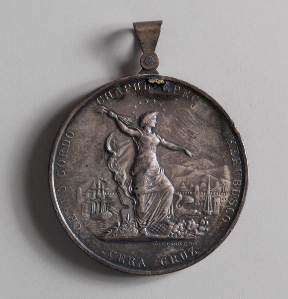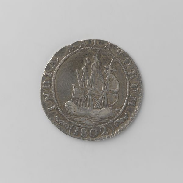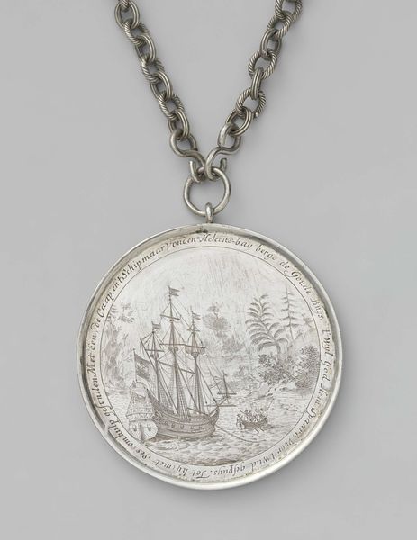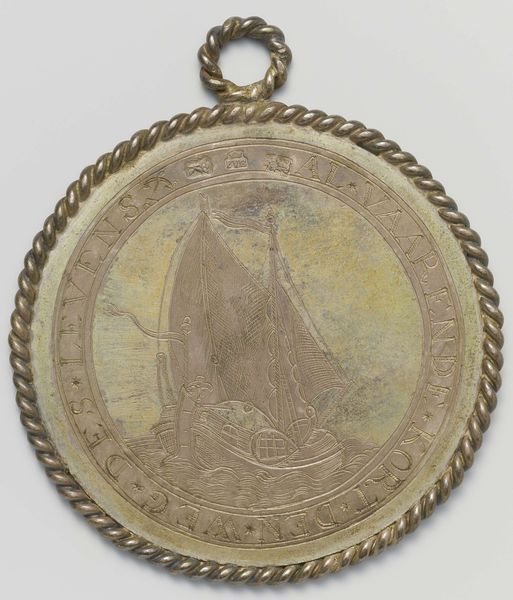 Curator: At first glance, this object strikes me as intensely melancholic, doesn't it? A solitary ship on turbulent waters, cast in stark silver… there’s a sense of foreboding. Editor: I can see that. Its silvery tones certainly lend it a feeling of austere reflection, which ties in nicely when you look into the broader story around its creation. We’re looking at a guild badge, specifically, one bestowed by the Schippersgilde, or Boatmen’s Guild, of ‘s-Hertogenbosch between 1780 and 1781, onto their leader, Claude Antoine Lormier. Curator: It speaks of the powerful symbolism of ships through time—conveyors of people, goods, and ideas. Notice the rope-like design circling the medallion. Such a beautiful, evocative detail, perpetually reminding of maritime travel! I also see an inscription circling the central ship image - could it represent the guild’s values? Editor: Indeed. The inscription in Dutch, translated, alludes to “life’s voyage being shortened”, acting as a memento mori – not unexpected given the often-dangerous lives of 18th-century boatmen and their dependency on sometimes brutal trade conditions. But that single ship also suggests a certain level of societal privilege for guild leaders - removed, somewhat, from their peers and other locals due to economic circumstances, but still subject to many risks from international commerce! Curator: The baroque styling – can’t you just feel it radiating from this guild badge! But within such ornate design, there's this profound focus on mortality and temporality; it certainly shifts how one views the piece. It takes the grandiosity of power, something like a guild badge, and adds such humbling contrast with a potent reminder. Editor: Absolutely. It acts almost as an exercise in humility - as powerful as Claude Antoine Lormier may have been as leader of the Schippersgilde, his badge makes plain the limited nature of material authority or influence in light of bigger forces like weather, luck, or economic shifts. Even a gilded position will face eventual ruin. Curator: So much contained in what seems like such a straightforward image! It reveals how art is able to act as a sort of memory container over vast stretches of history - here it reminds both past guild members and present-day viewers to remain conscientious in the present while also being conscious of both the historical and philosophical pasts. Editor: Precisely! It’s a stark reminder that even in the late 18th century, anxieties around life, death, power and fortune weren't all that different. And as climate change now places shipping under renewed scrutiny, the medal seems oddly contemporary in highlighting these industries and our collective fates.