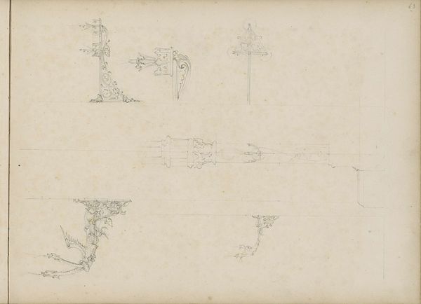 Curator: Here at the Rijksmuseum, we have a drawing by Pierre Joseph Hubert Cuypers. This piece, aptly named "Kandelaar," or "Candlestick," was drafted between 1857 and 1859 using pencil. Editor: It's faint, isn't it? A ghostly premonition of form. It almost feels unfinished, like peering into the artist's thought process as he imagines light and shadow dancing around this object. Curator: Exactly! Cuypers was a key figure in the Gothic Revival movement in the Netherlands, and this drawing is likely a design study for a larger architectural project. Consider the societal push for rediscovering the past through detailed reproductions that informed this and similar projects during the era. Editor: It’s fascinating to see that level of detail captured in a simple pencil sketch. It reveals, to me, his reverence for Gothic forms. The floral motifs, the symmetry…they speak volumes about the artistic climate of the time, no? Curator: Absolutely. Drawings like this weren't just functional; they were arguments. Cuypers was advocating for a return to what he saw as a more authentic, spiritually resonant architecture. How it could uplift the public spirit! Editor: It makes you wonder how many public buildings stand today informed by humble studies just like this. It connects us to a moment where someone envisioned beauty in light and space. Looking at this I think back to times when people believed the built environment would impact their behaviour; the power art once wielded in everyday life. Curator: Indeed. It is easy to dismiss technical drawings. And yet this drawing offers a privileged peek behind the scenes of art history as well as how it helps craft a collective visual culture and our public spaces. Editor: Agreed. It whispers about aspirations beyond mere utility, back into a shared and glorious vision.