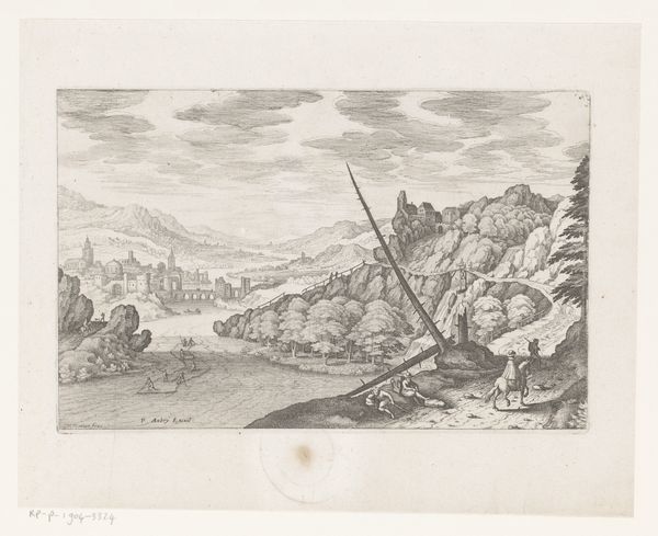 Isaak Major created this print of the crucifixion in the early 17th century, a time when the Netherlands was undergoing significant religious and political upheaval. The image presents a panoramic view of the crucifixion scene, set against a landscape filled with figures, both on foot and horseback. Major emphasizes the spectacle of the event, drawing our attention to the social dynamics at play. Notice how the composition directs our gaze toward the figures surrounding the crosses, inviting us to consider their roles and motivations. The print reflects the religious tensions of the time, as the Netherlands was divided between Catholics and Protestants. Major's portrayal of the crucifixion, a central event in Christian theology, speaks to these divisions. To understand this work better, we would need to research the artist’s religious affiliation, as well as the cultural and political context in which he was working. This print serves as a powerful reminder of the ways in which art is shaped by the social and institutional forces of its time.