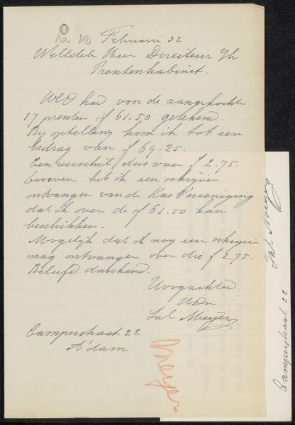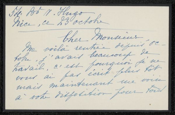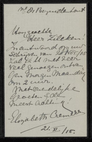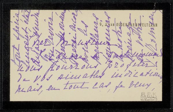Curator: Let’s look at this “Telegram aan Pieter Haverkorn van Rijsewijk,” likely from 1911, created by Theo Colenbrander. It's ink on paper, essentially a handwritten message. What strikes you immediately? Editor: The visual simplicity is compelling. The composition is quite linear, dictated by the telegram form, and the handwriting… it feels both urgent and personal, creating an interesting tension. Curator: I agree. Knowing Colenbrander's broader artistic context is essential here. He was deeply embedded in the Dutch decorative arts movement, actively working to create artwork for, and cultivate an appreciation among, a wide public audience. In the cultural climate of the time, accessible forms of communication such as this telegram played an important role in bringing art to everyday life. Editor: Right, the formal qualities of the typography can be understood through a semiotic lens. Look at the thick font and stylized text, these elements of hand-lettering, the weight of the lines, all contributing to its immediate legibility but also imbuing it with artistic intention beyond pure utility. The fading typeface almost underscores this transition into an artifact of the past. Curator: Exactly. I’m intrigued by the brevity and the message. "Met moreel bevriend, heb niets gelezen. Brief volgt”..."In good spirits, haven’t read anything. Letter to follow." Consider the social dynamics. There's a power imbalance here; Colenbrander controls information, keeps someone waiting. The telegram itself then becomes not only a functional instrument, but a commentary on the anxiety produced in communication within specific hierarchical contexts. Editor: Hmm, I still am most interested in the fact that a supposedly 'cold' and purely functional communication like a telegram has been re-appropriated here to make something distinctly aesthetic out of it. Colenbrander treats it as a compositional challenge and turns it into this curious artwork through the quality of his handwriting and how that interplays with the standardised printed forms. Curator: That speaks to the core of his oeuvre—blending utility with artistic flair. Thanks, I can certainly see and appreciate this work differently after considering our observations today. Editor: My pleasure. The piece has also made me reconsider my own prejudices towards what might qualify as 'artistic' vs. 'functional'. It goes to show, really, that looking carefully matters.