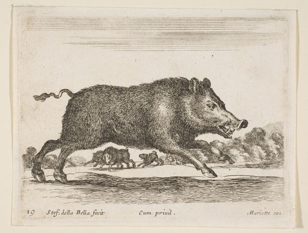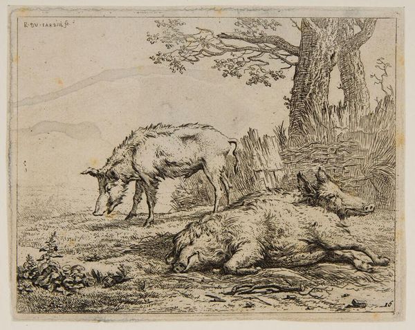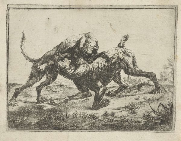 Curator: Welcome. Before us is “Fighting Dogs,” or “Vechtende honden” as it's known in Dutch, an etching and engraving likely created between 1657 and 1707. Its maker remains anonymous. What's your first impression? Editor: Chaos! Raw energy, primarily. Look at those lines! The artist really captured a sense of unrestrained canine aggression. There's a coarseness to the rendering; it's almost like feeling the texture of the dogs’ wiry fur under my fingers. Curator: The realism, combined with that almost brutal energy, definitely sets this piece apart. Considering the era, one wonders about the social context. Dog fighting, while perhaps not as formalized as later, still held a place in certain social circles, hinting at themes of competition, dominance and social hierarchies playing out through animal combat. Editor: And I'm immediately drawn to the question of the printing process itself. These kinds of prints were quite democratic—allowing a broader audience to engage with imagery that might have otherwise remained exclusive to painted commissions or private collections. The lines, seemingly simple, betray considerable skill in transferring an image onto a plate to mass produce it later on paper. What paper did they use, what inks, how worn was the metal? Curator: Exactly, it became accessible through distribution of such prints! It offered a commentary that reached the wider populace, thereby playing a vital public role as cultural record. This speaks volumes about the democratizing power of printmaking. One sees art not only in grand paintings, but in everyday observations replicated for the masses. Editor: Absolutely, we're talking labor here. The engraver, the printer, their workshops… it creates a whole economic and social ecosystem around producing images. To appreciate the print fully, one has to envision this whole chain of material production, from raw materials to distributed image, and thus, this type of art truly brings it home. Curator: The distribution highlights art's pervasive influence on social norms, behaviors and class. This seemingly minor piece offers an incisive view of a specific period and provides rich insight for anyone open to its societal implication. Editor: Agreed, beyond a depiction of fighting dogs, it encourages a tangible engagement with both the artwork and the historical production itself. I find this to be deeply fascinating, because its implications keep rippling outward.