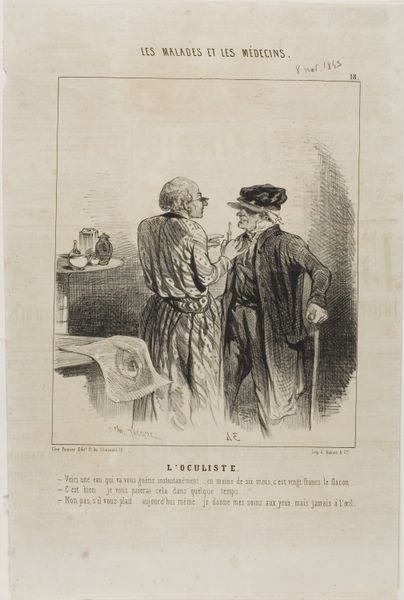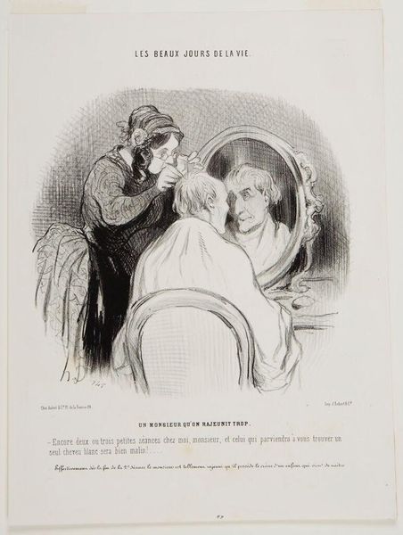 Editor: We're looking at "An Exaggerated Rejuvenation…" a lithograph by Honoré Daumier, dating back to about 1845. The subject seems to be the act of trimming someone's hair, but the expressions are making me chuckle, especially the patron's gaze at his reflection. What do you see in this print? Curator: I observe the sharp contrasts in line that define Daumier’s caricature, note especially how this tension lends dynamism to the composition. Focus on the shapes, if you will, the rounded chair back plays with the more angular barber and her client. What does this visual rhythm suggest to you? Editor: The shapes and the high-contrast really guide your eyes all around the image, the chair and mirror frame your gaze to the man’s face! Is there a balance happening there, of figure and ground? Curator: Precisely! The interplay of light and dark areas creates visual interest and serves to underscore the caricature. What strikes you about Daumier’s rendering of human form? How does he abstract reality to express deeper meaning? Editor: Well, it’s a far cry from idealized portraiture, that’s for sure! But he seems interested in capturing expressions that hint at vanity and perhaps a bit of skepticism on the client's part, which echoes in the barber's intense focus. The title definitely contributes to this narrative too! Curator: The integration of text becomes paramount; note how its semiotic relation and Daumier’s mark-making result in pointed critique. These elements cohere in his astute commentary on contemporary French society. I am struck by the stark assessment of beauty and age through visual metaphor. Editor: So much is conveyed in just a few strokes of the lithographic crayon! This deep dive into Daumier's methods has highlighted how form and content combine to express social commentary. Curator: Indeed. This analytical process underscores how Daumier harnesses formal qualities to elevate societal critique.