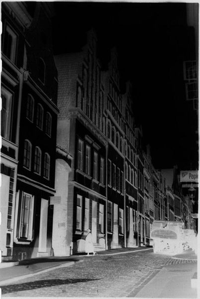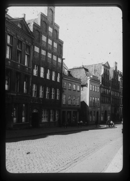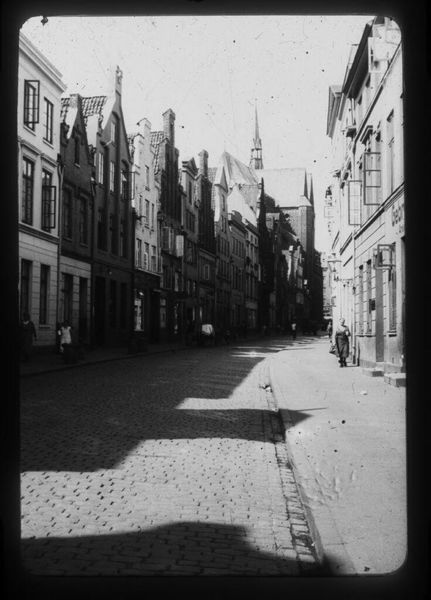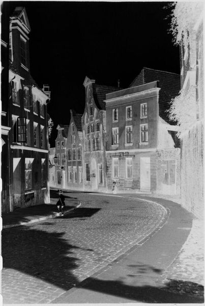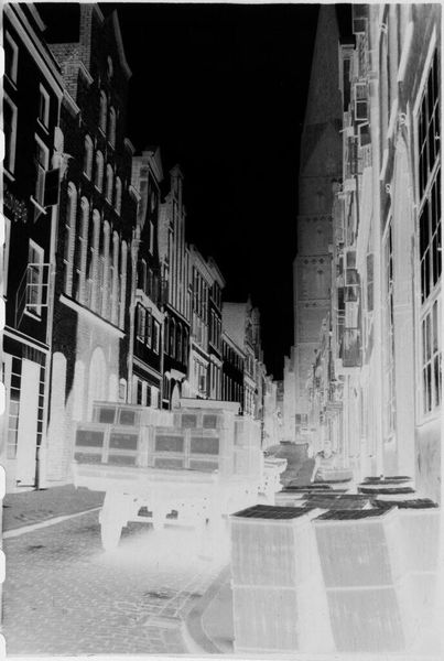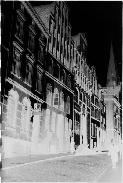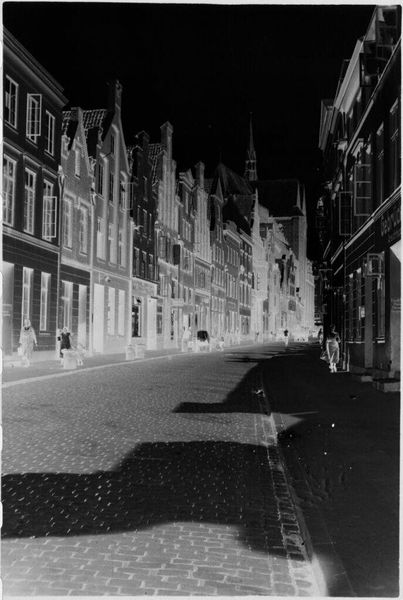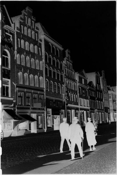 Curator: This is "Street scene in Lübeck," attributed to Laurence Feininger. The photograph, a small gelatin silver print, captures a streetscape. Editor: It has a very stark, almost ghostly quality. The inverted tones give the cobblestone street and buildings a strangely ethereal presence. Curator: Indeed. Note the pronounced vanishing point created by the converging lines of the architecture, effectively guiding the viewer's eye. It creates a rhythmic interplay of light and shadow. Editor: I am compelled by the figures. They are seemingly frozen, and this makes me think about the impact urban planning had on marginalized communities in the early 20th century. Curator: A fascinating reading. The composition certainly invites multiple interpretations. Editor: Absolutely. The inverted tones shift one's perspective, which invites reflection on the stories often untold or unseen in familiar landscapes. Curator: A reminder of the photograph's power to reveal and obscure. Editor: And to question whose stories get told.