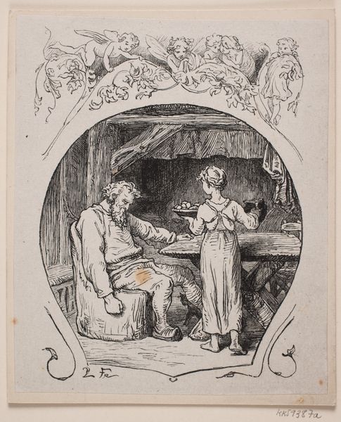 F. Hendriksen created this illustration for "En moders barndomserindringer" using ink on paper. This piece invites us to consider the complex roles and expectations placed upon women and children in 19th-century Danish society. The scene depicts a young girl dutifully serving a man, likely her father or grandfather. The composition emphasizes her subservient position. The cherubic figures at the top add a layer of sentimental idealization, framing the domestic scene with notions of innocence and purity. Yet, the stark contrast between the ethereal figures and the humble setting hints at the harsh realities of everyday life, especially for women and girls. This artwork develops a narrative around domesticity, duty, and the emotional weight of familial expectations. The artist captures a moment of quiet service that speaks volumes about gendered roles and the lived experiences of women in this period.