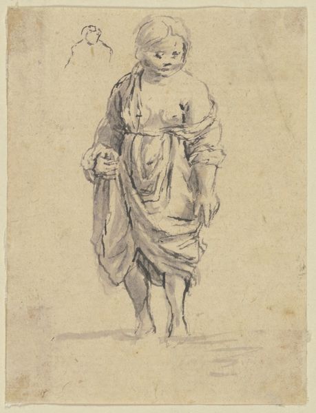 Curator: This is "Seated Woman Reading" by François Boucher. It’s undated, but most likely a study for a larger painting, rendered in chalk and pencil, which you can currently appreciate at the Art Institute of Chicago. Editor: There’s an immediate intimacy about it, isn’t there? The soft lines, the monochrome reddish hues...it feels almost like catching a private moment, as though we are glimpsing at someone completely lost in thought and words. Curator: Absolutely. Boucher's rococo style usually brings visions of courtly love and mythological frolics. Here, he focuses on quiet contemplation, using confident, flowing lines. Note the attention paid to the drape of the clothing, adding to the overall sense of serenity. Editor: Indeed. There's a real tension between the almost frantic energy of the linework and the utter stillness of the subject. It's like he's captured the movement of thought itself—the energy of her mind reflected in those almost scribbled lines. Do you think it’s a preparatory sketch, as opposed to a finished piece? Curator: I am pretty convinced of that because it reflects the preliminary stage for larger works, as a chance for Boucher to work out the composition and study the fall of light on the fabrics. I suppose the drawing would allow the painter to explore poses, drapery, and mood before committing to canvas. Editor: Well, it’s incredibly effective. The slight upward tilt of her face also gives the image a devotional quality. Though, rather than prayer, her devotion is given to the act of reading, an active pursuit, and a powerful form of introspection. Curator: True, reading, especially then, was often a performative social act. This private consumption indicates a shift and celebrates a quiet independence available to her. The book becomes a symbol, a source of personal power. Editor: It makes you wonder what she's reading, doesn't it? And what world is she escaping into? Curator: Or creating for herself, perhaps? The drawing suggests so many stories beyond what we see. It really embodies the potent combination of the inner world and the external form, capturing both with extraordinary delicacy. Editor: A sentiment, beautifully expressed, and as elusive, perhaps, as capturing the essence of a fleeting thought. Thank you for helping to shape our understanding.